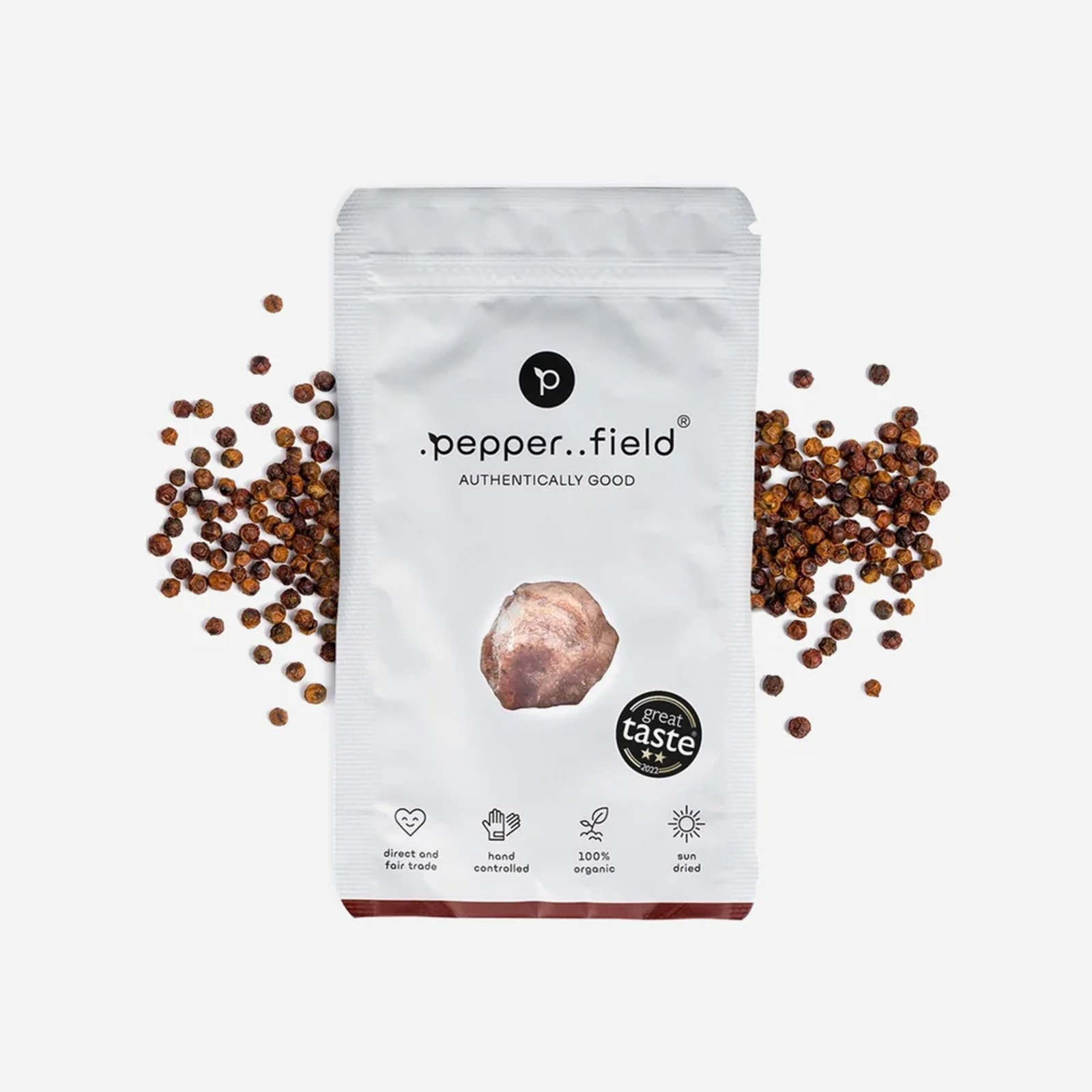 Červené korenie je druhom korenia pochádzajúceho z čierneho korenistého (Piper Nigrum). Jedná sa o plody korenia zbierané pri plnej zrelosti, vďaka čomu sú plné sladkej fruktózy a intenzívnych ovocných vôní. Farmárske rodiny pod .pepper..field ho zbierajú ručne, jednotlivo po guličke, a následne sušia niekoľko dní na slniečku. Tým guľôčky získavajú svoj charakteristický odtieň a zvraštenú štruktúru.