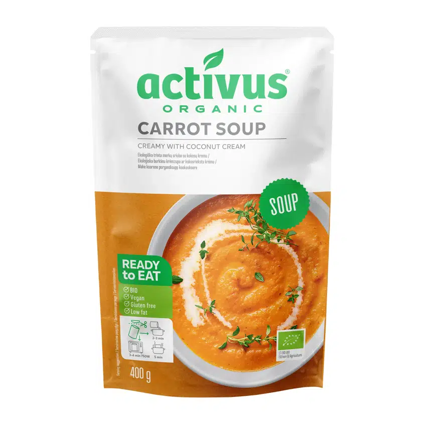 Mrkvová polievka má skvelú chuť, je uvarená z mrkvy vypestovanej a zbieranej na farmách, je dochutená kokosom, korením a morskou soľou.