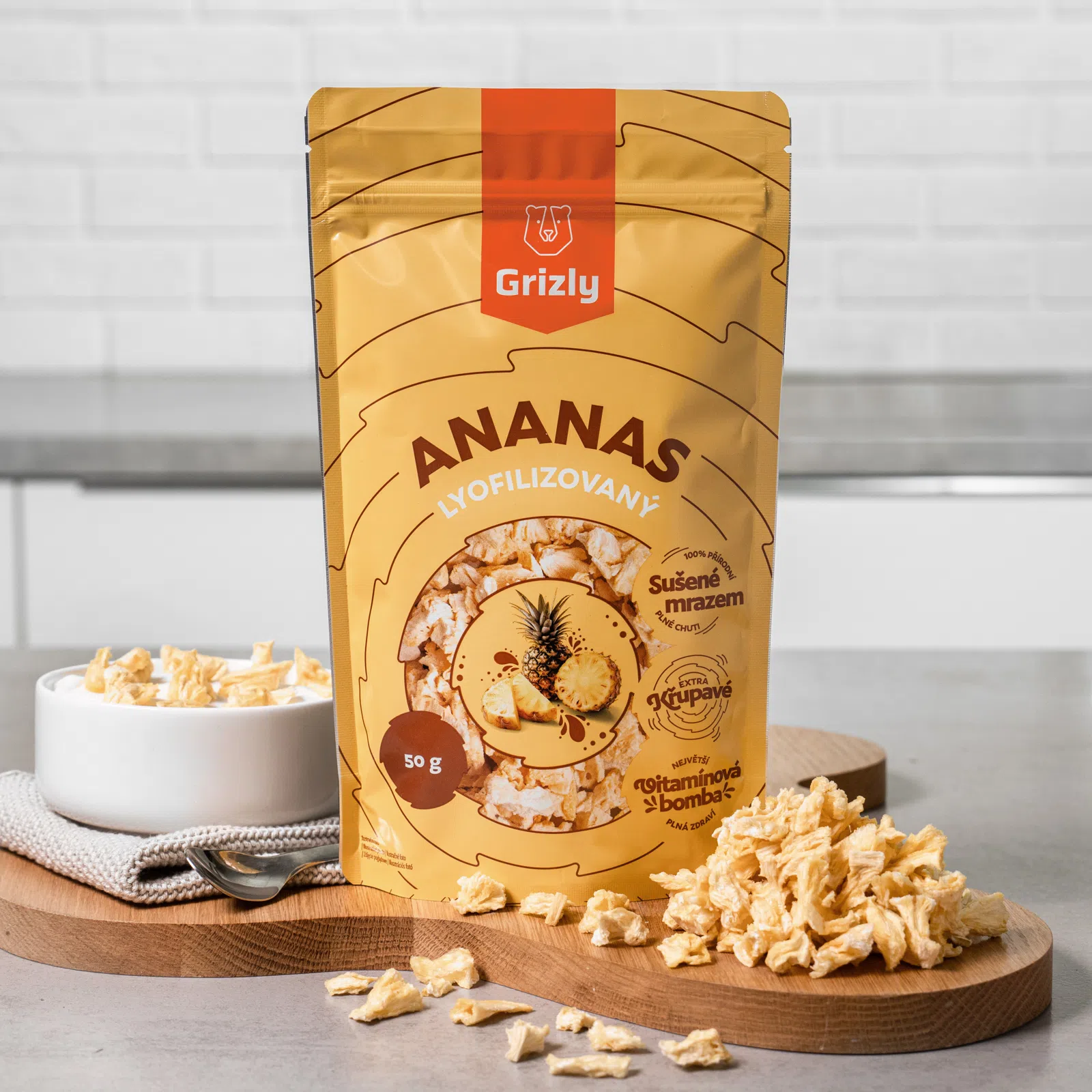 GRIZLY Ananás lyofilizovaný krásne chrumká, a ešte lepšie chutí. Balíme ho do znovuuzatvárateľného balenia, takže si svoju chrumkavosť a čerstvosť uchová.