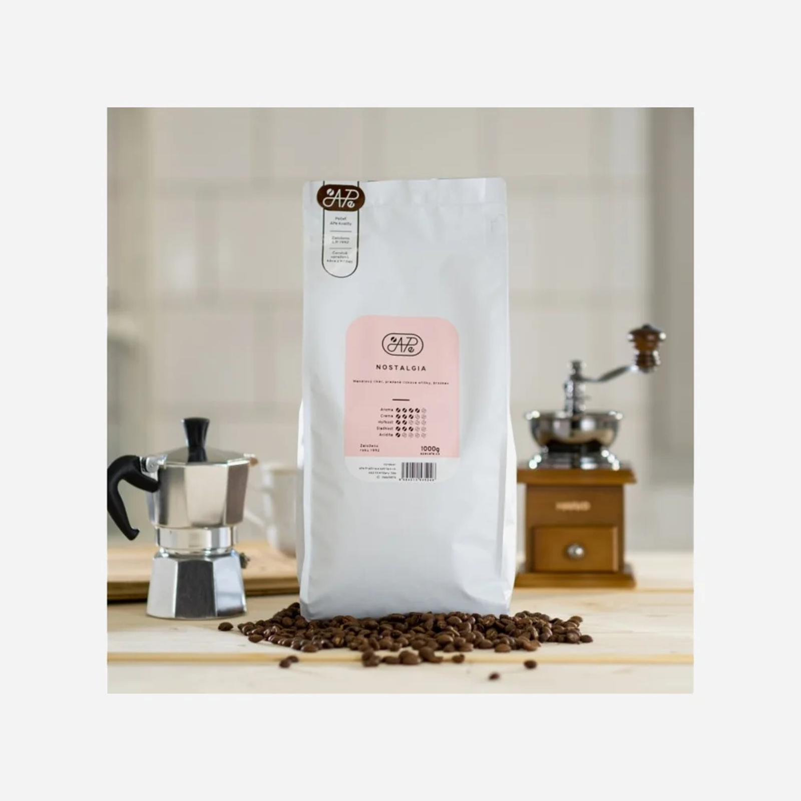 Káva Nostalgia je veľmi jemná káva arabika. Kávu podobnej receptúry si pán a pani Pejškovi, zakladatelia pražiarne APE, pripravovali už pred viac ako 20 rokmi. Teraz je čas podeliť sa o ňu aj s vami. Je veľmi jemná, aby vás nechala myslieť na to najpríjemnejšie. Usaďte sa, spomaľte. Nostalgia čaká len na vás.
