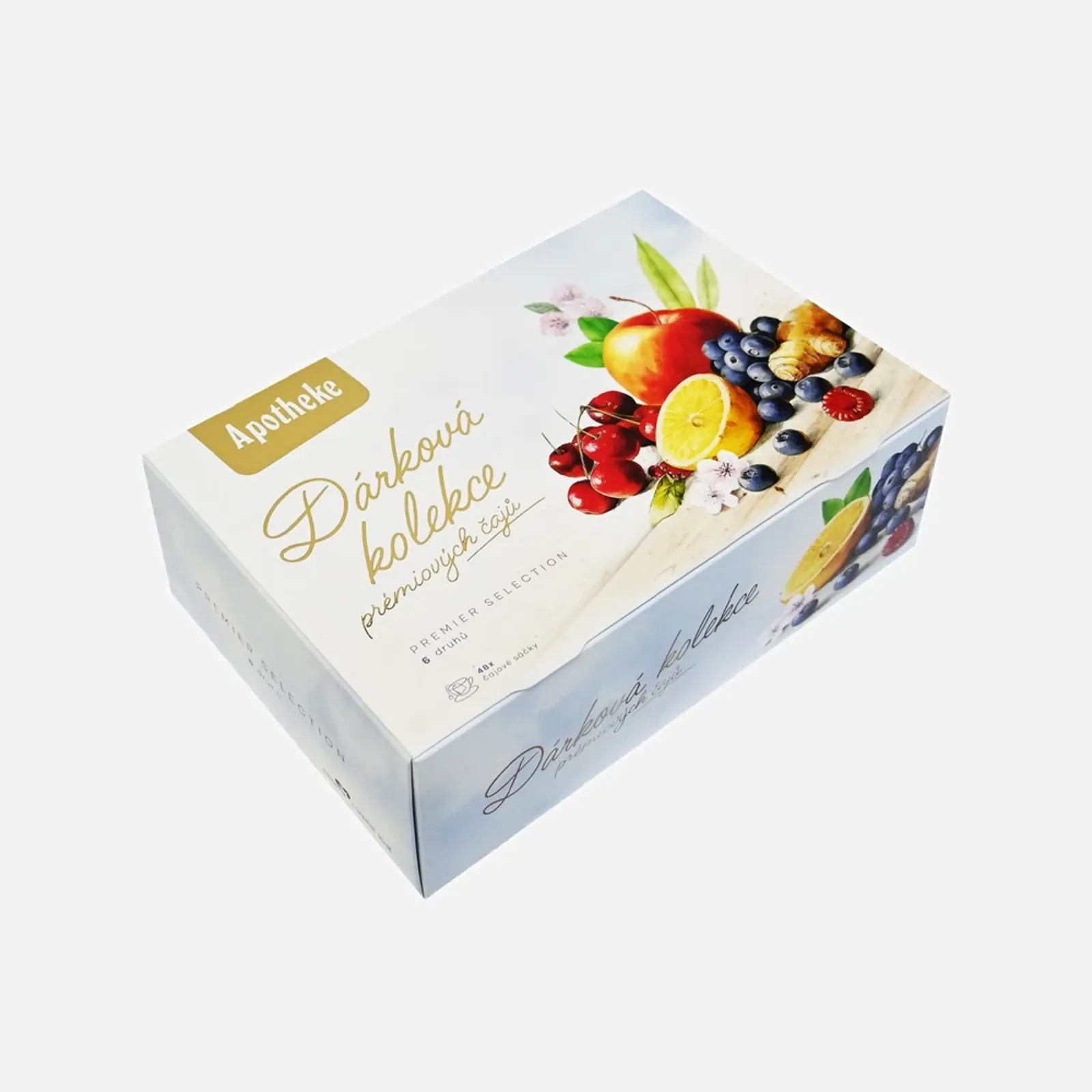 Darčeková kazeta s vybranými prémiovými čajmi Apotheke, ponúka pestrú škálu nevšedných aj osvedčených ovocných chutí.