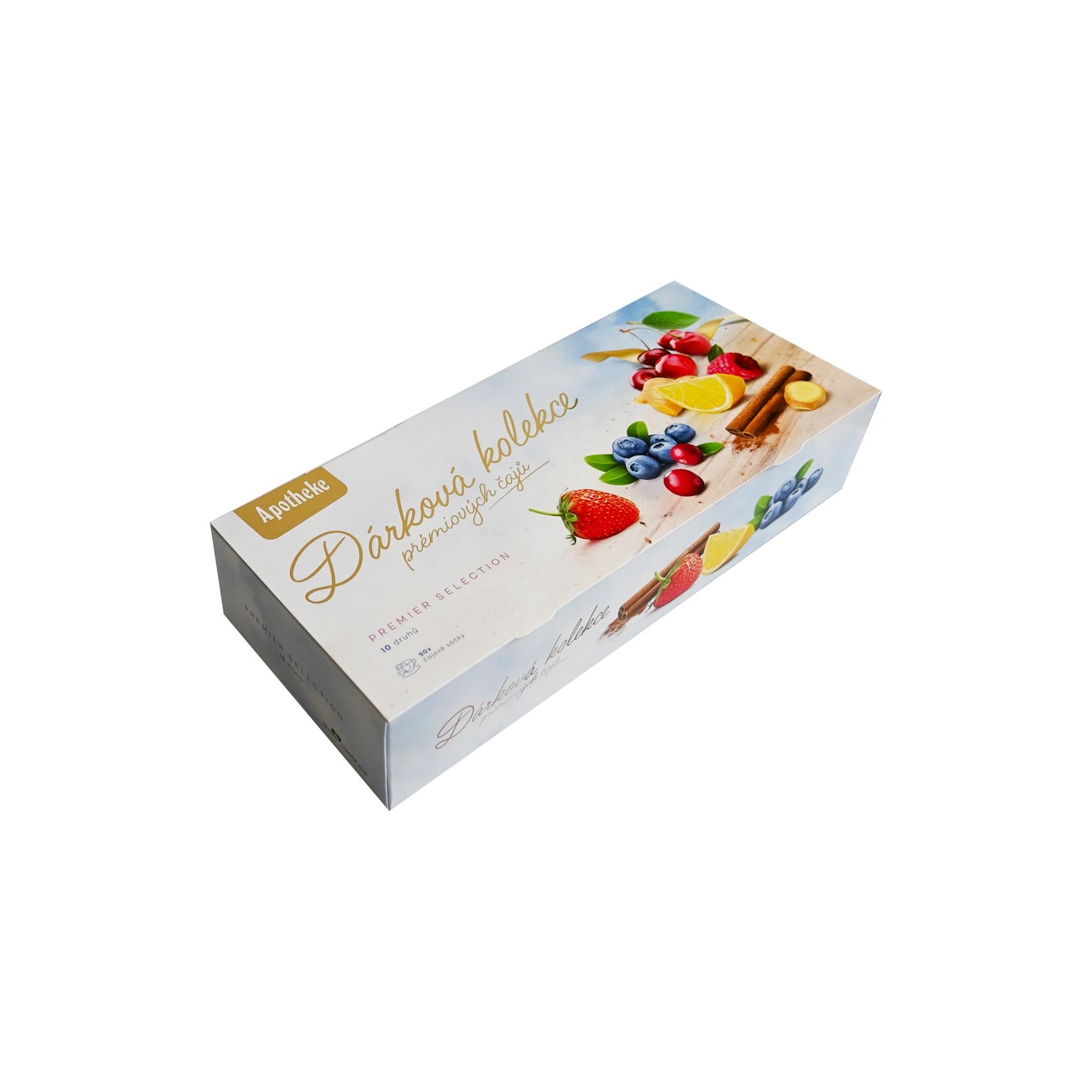 Darčeková kazeta s vybranými prémiovými čajmi Apotheke, ponúka pestrú škálu nevšedných aj osvedčených ovocných chutí, doplnená aj čiernym a zeleným čajom. Môžete si ich vychutnať sami, alebo venovať ako darček Vašim blízkym. Balenie obsahuje 10 druhov čajov po 9 kusoch, celkom 90 nálevových vrecúšok.