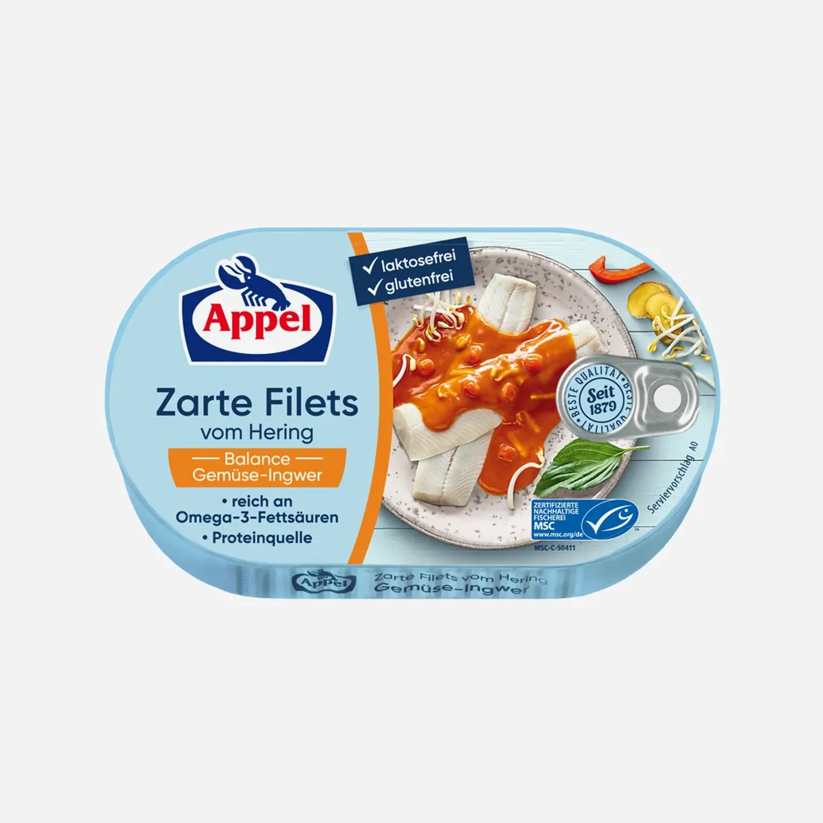 Filety sleďov v sladkej a kyslej zeleninovej omáčke so zázvorom. Appel MSC Certified Delicate Wellness sledovať filety Balance vo vyváženej sladké a kyslé zeleninové omáčke s pikantným zázvorom. Neobsahuje lepok a laktózu / bohaté na omega-3 mastné kyseliny / bez konzervačných prísad / bez príchutí.