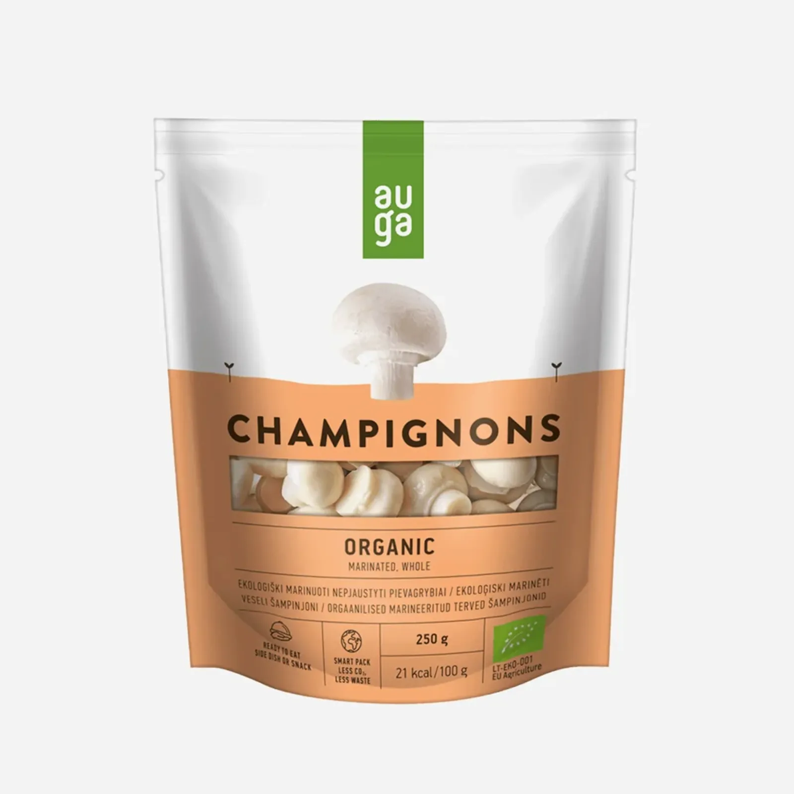 Marinované šampiňóny sú pripravené k jedlu ako olovrant. Chutné, chrumkavé a malej veľkosti sú tiež ideálne pre šalát alebo akúkoľvek prílohu.