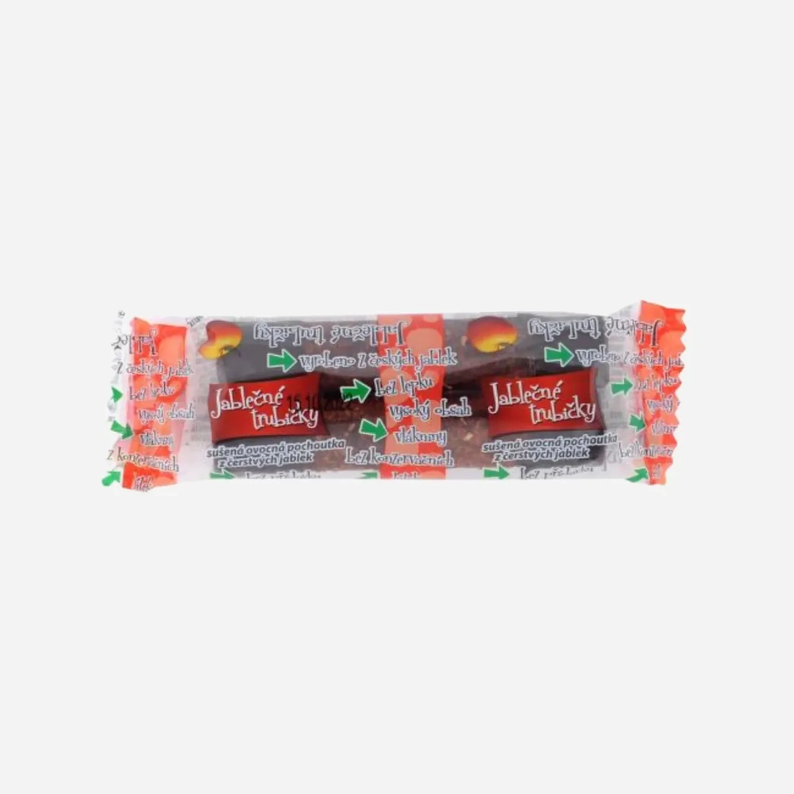 Sušená ovocná pochúťka vyrobená z čerstvých jabĺk, čiastočne polievaná čokoládovou polevou.