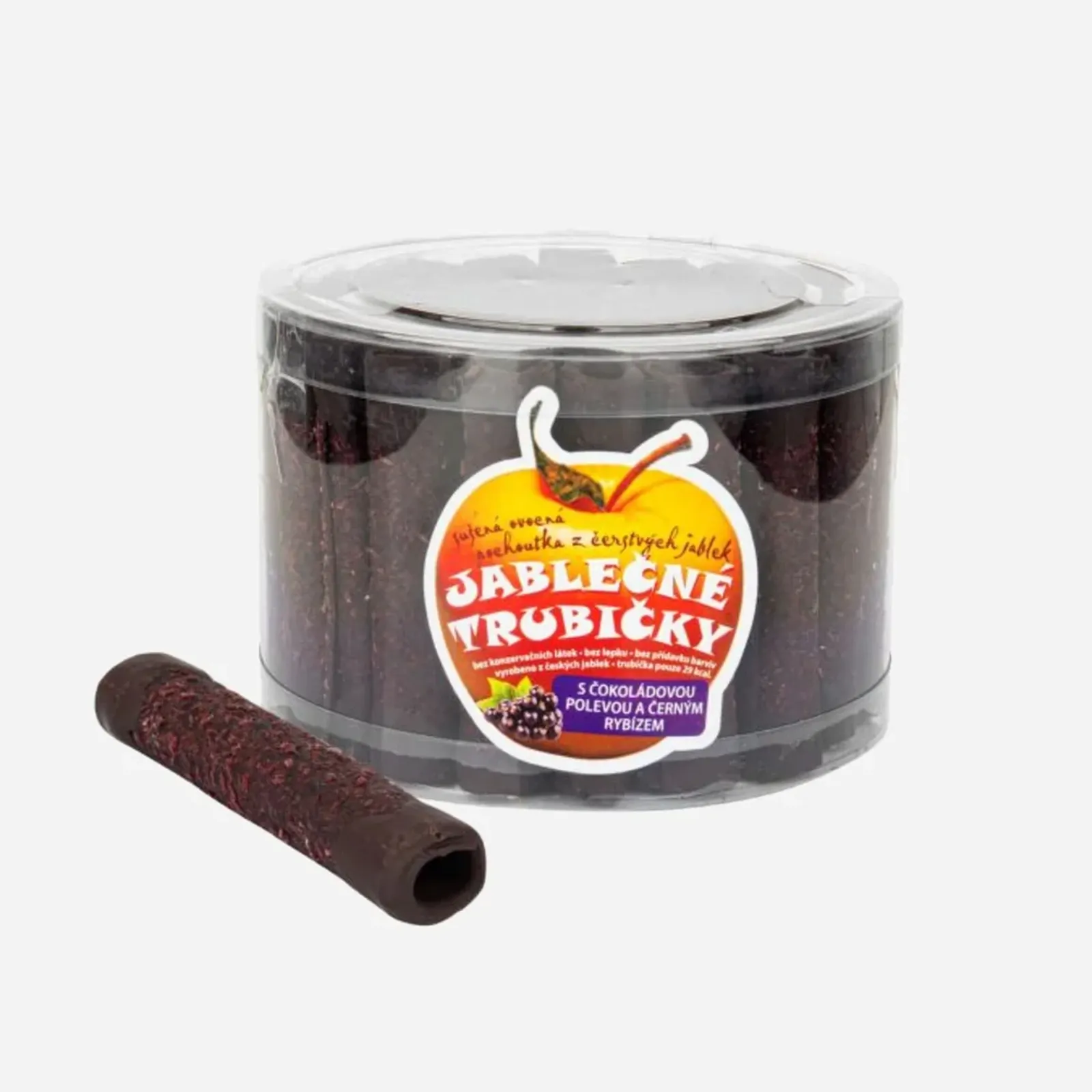 Sušená ovocná pochúťka vyrobená z čerstvých jabĺk a ríbezľového koncentrátu, čiastočne polievaná čokoládovou polevou.