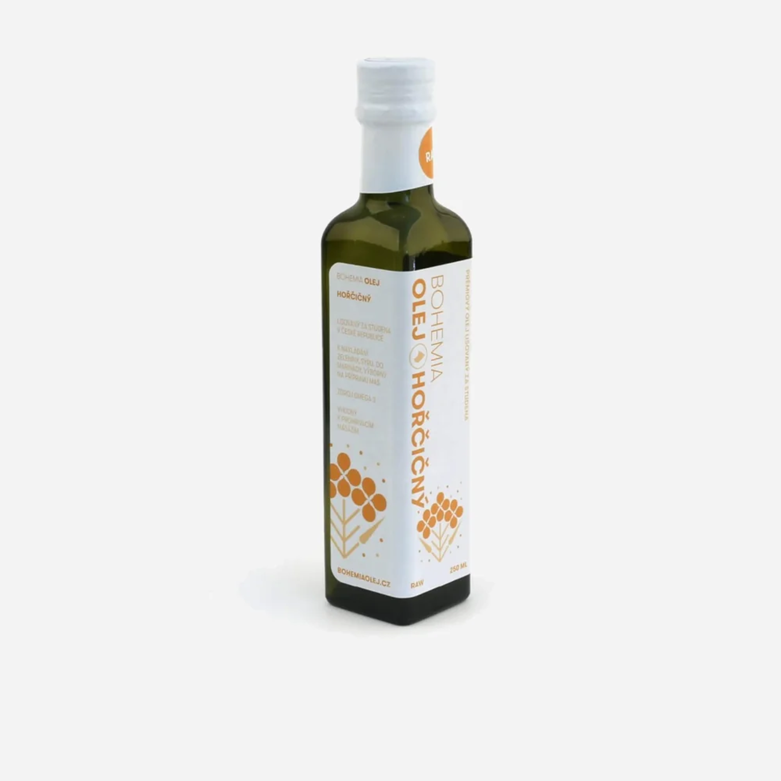 Bohemia oleje sú lisované v Západných Čechách tradičnou šetrnou metódou za veľmi nízkych teplôt. Nesú viac než kvalitu olejov lisovaných za studena, sú to oleje RAW. Výlisnosť je tak síce nižšia, ale olej si tak uchováva chuť, vôňu i hodnotný komplex biologicky aktívnych látok horčičných semienok. Bohemia horčicový olej má sýto žltú farbu a pikantnú chuť, ktorá prehreje na tele i na duchu. Svojou pikantnosťou zaujímavo okorení šalátové zálievky, domáce majonézy, dipy. Je vhodný aj do teplej kuchyne. Marinované mäso v horčičnom oleji krásne skrehne a zachová šťavu. Vďaka svojmu zloženiu pôsobí ako prírodný konzervant, je preto výborný na nakladanie húb či zeleniny.