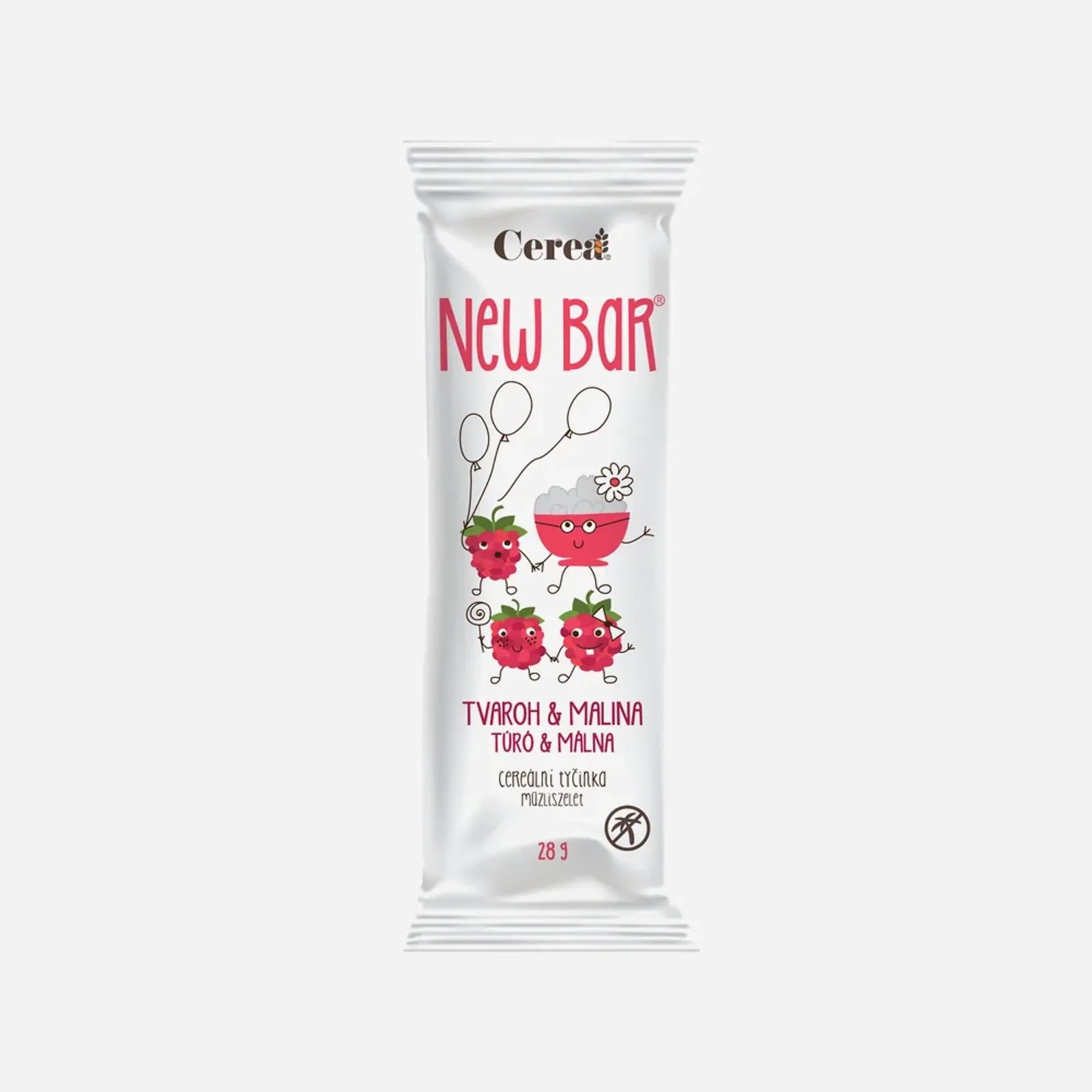 Cereálie 45% (ryžový crispies 23% (ryžová múka 91%, cukor, jačmenný sladový výťažok 2,3%, jedlá soľ), ovsené vločky 22%), tekutý invertný sirup, maltózový sirup, repkový olej, sójová múka, ochucovacia prášok s tvarohom 4% (dextróza, nízkotučný tvaroh v prášku 20%, sušená srvátka, regulátor kyslosti: kyselina citrónová, laktóza, sušené odstredené mlieko, mliečna bielkovina, prírodná aróma), mrazom sušené maliny 2,8%, sušené cmar 2,8%, sladené zahustené plnotučné mlieko 2% (kravské mlieko, cukor, laktóza), jahodová pasta (cukor, mrazené jahody 20%, glukózový sirup, regulátor kyslosti: kyselina citrónová, voda, koncentrovaná jahodová šťava 2,8%, jahodová semienka, farbivá: antokyaníny , kurkumín, prírodná aróma, zahusťovadlá: pektín, guma tara), ovsená vláknina, prírodná aróma malina.
