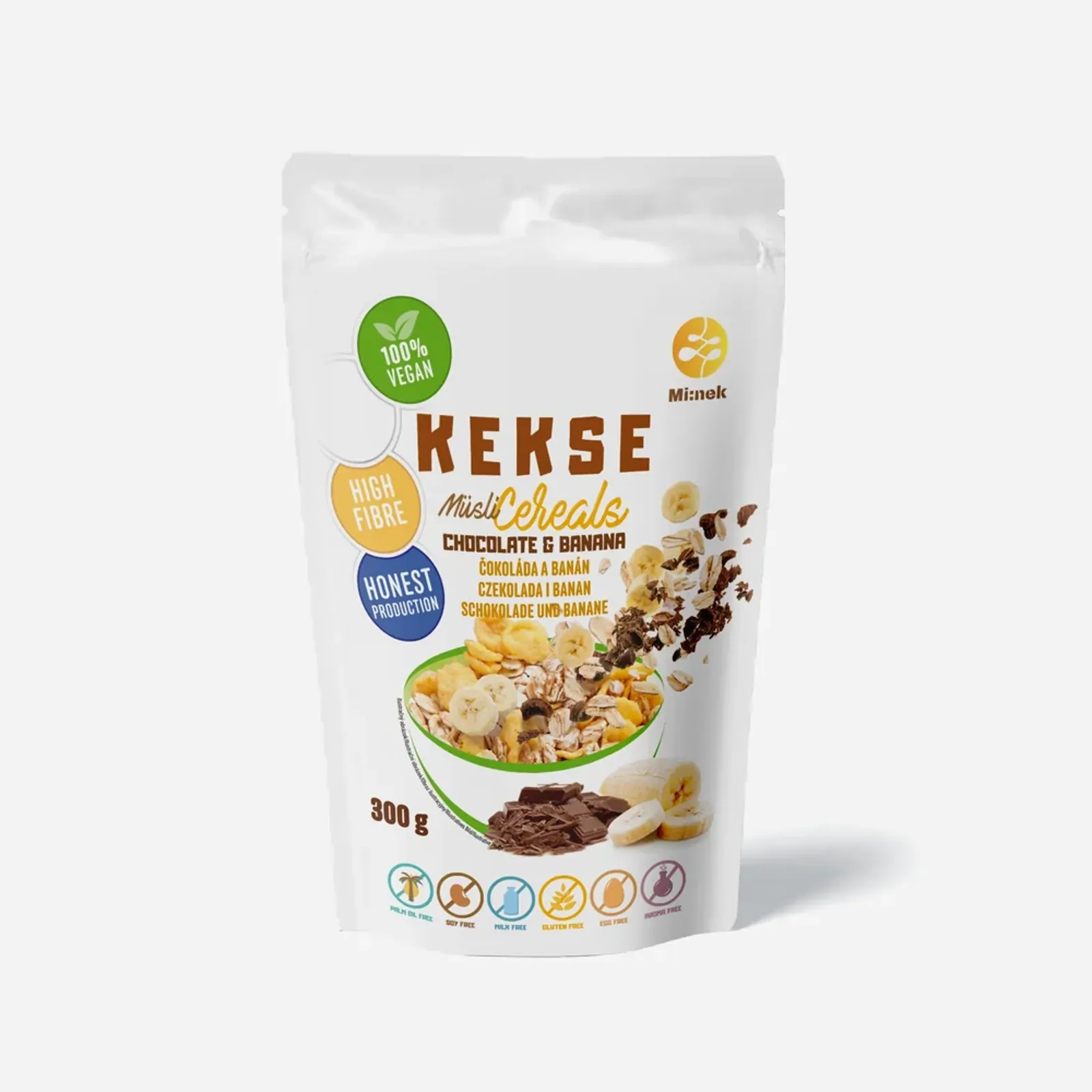 Lahodná müsli zmes s kúskami ovocia. Prirodzene bezlepková a vegánska s kúskami banánu a kúskami 60% vegánskej horkej čokolády. Základom sú prémiové ovsené vločky a kukuričné lupienky. Táto müsli zmes je plná kvalitných surovín, kde šetrenie s ovocím a inými ingredienciami v keksíkoch rozhodne nie je na mieste.