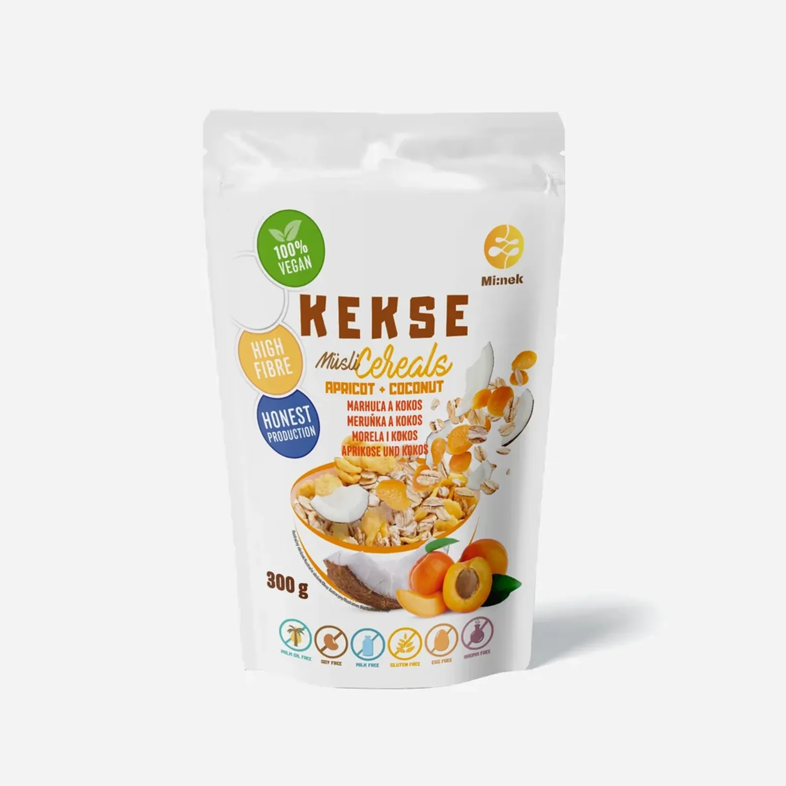 Lahodná müsli zmes s kúskami ovocia. Prirodzene bezlepkové a vegán s kúskami 60% vegán horkej čokolády a kúsky lieskových orieškov. Základom sú prémiové ovsené vločky a kukuričné lupienky. Táto müsli zmes je plná kvalitných surovín, kde množstvom ovocia a inými ingredienciami v Kekse nešetrí.