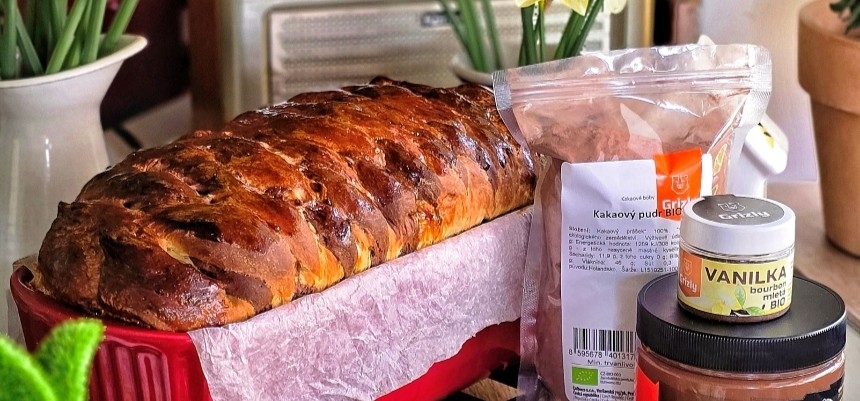 Po vykysnutí každé cesto rozvaľkajte na tenké pláty. Pláty položte na seba, na jednom okraji narežte strapce a zviažte ich. Na druhý koniec naneste čokoládový krém. Zrolujte do závinu a položte do formy vyloženej papierom na pečenie. Nechajte kysnúť ďalších 30–40 minút. - Pečenie