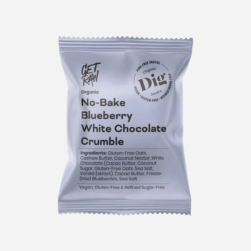 Zloženie: Bezlepkové ovsené vločky*, kešu maslo*, kokosový sirup*, biela čokoláda* 6 % (kakaové maslo*, kokosový cukor*, bezlepková ovsená múka*, morská soľ, vanilkový extrakt*, obsah kakaa 40 %), kakaové maslo*, mrazom sušené čučoriedky* 4 %, morská soľ.