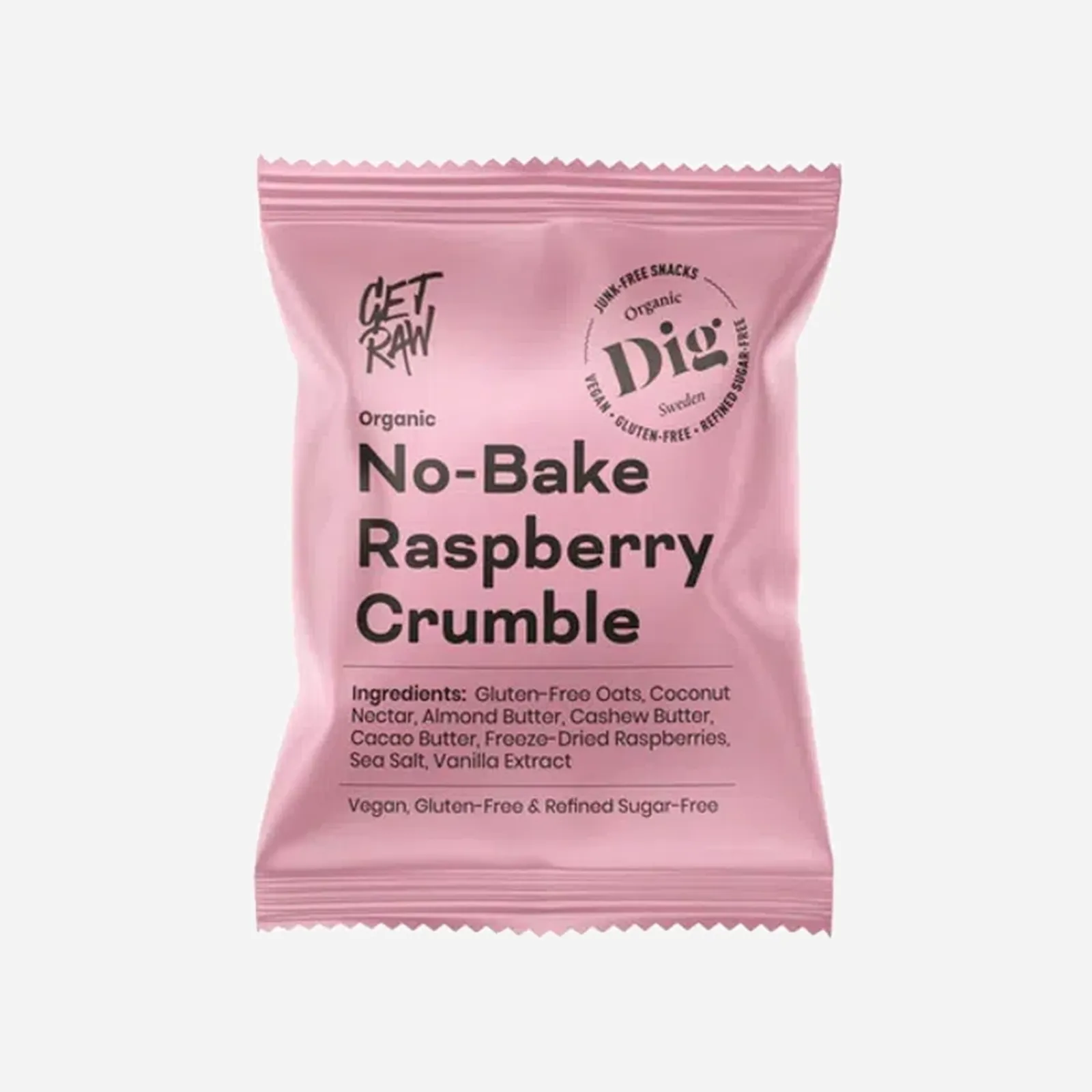 Zloženie: Bezlepkové ovsené vločky*, kokosový sirup*, mandľové maslo*, kešu maslo*, kakaové maslo*, lyofilizované maliny* 4 %, morská soľ, vanilkový extrakt*.