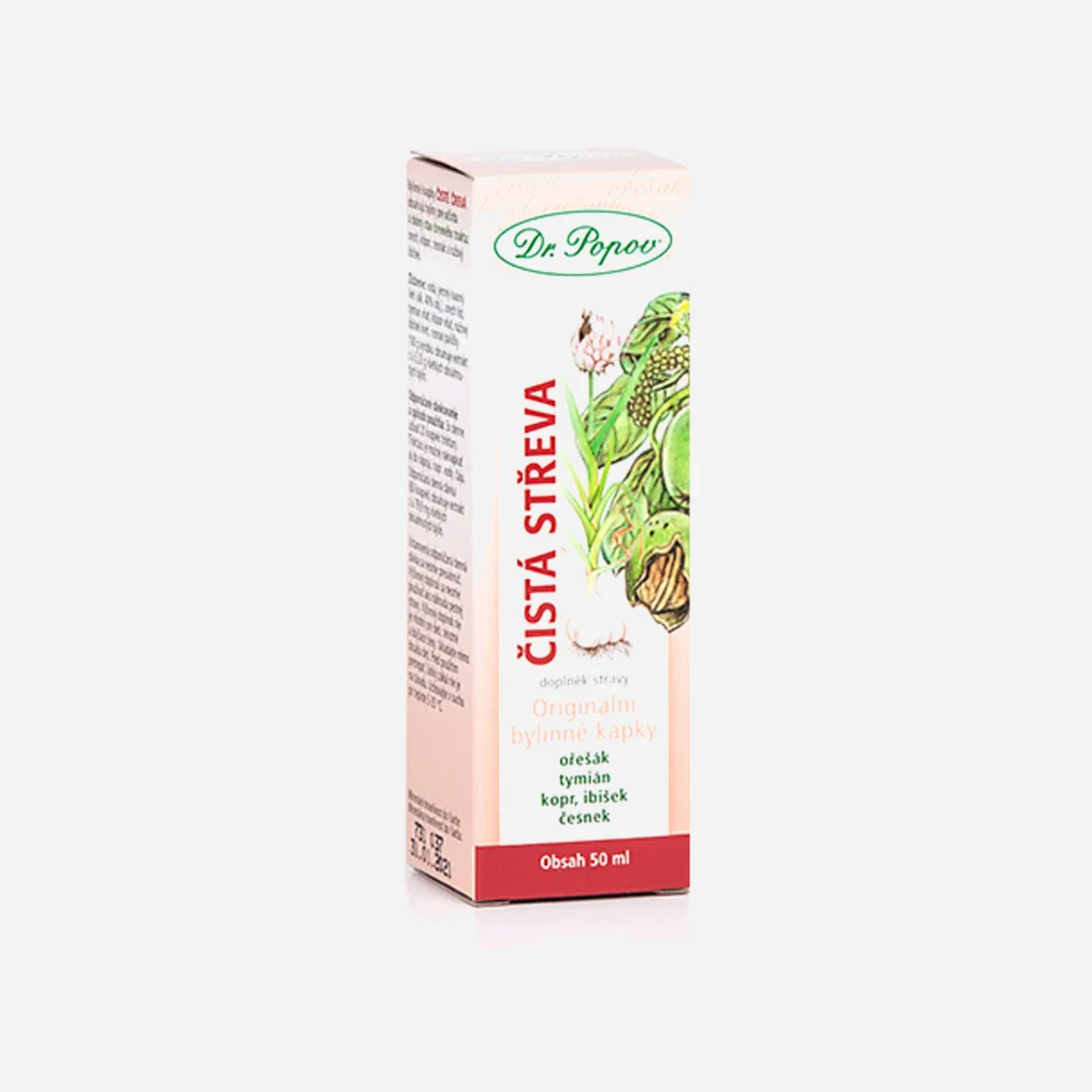 Bylinné kvapky Dr. Popova Čistá čreva obsahujú byliny pre očistu a dobrý stav črevného traktu: orech, kôpor, cesnak a ružový ibištek.