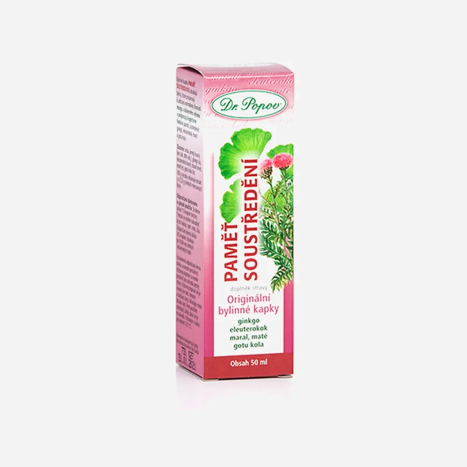 Bylinné kvapky Pamäť - sústredenie obsahujú byliny, ktoré prispievajú k udržaniu normálnej činnosti mozgu a duševného výkonu a podporujú kognitívne funkcie (pamäť, sústredenie): ginkgo, eleuterokok, maral a gotu kola.