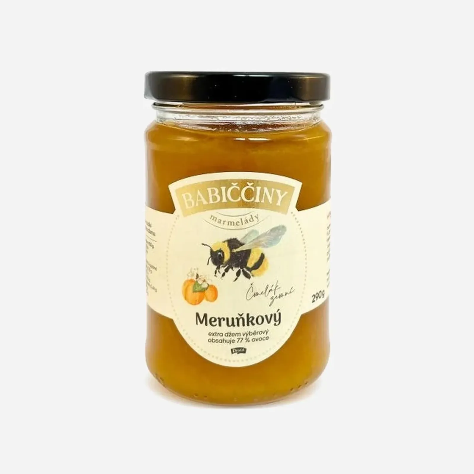 Zloženie: Marhule 77 %, cukor, želírujúca látka: pektín. Pasterizované.