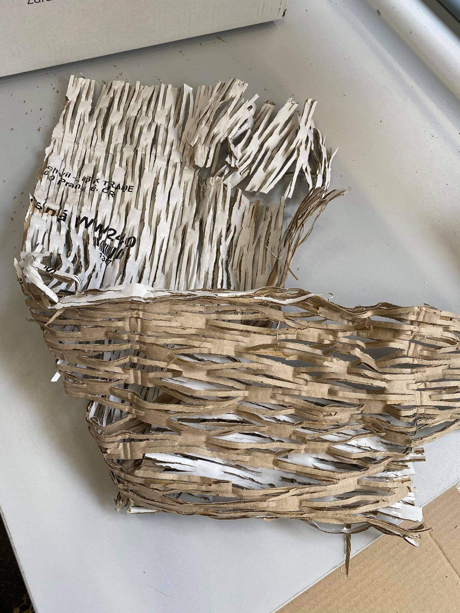 - zásielku vyplníme efektívne narezanými kúskami už použitého kartónu v tvare sukienok
