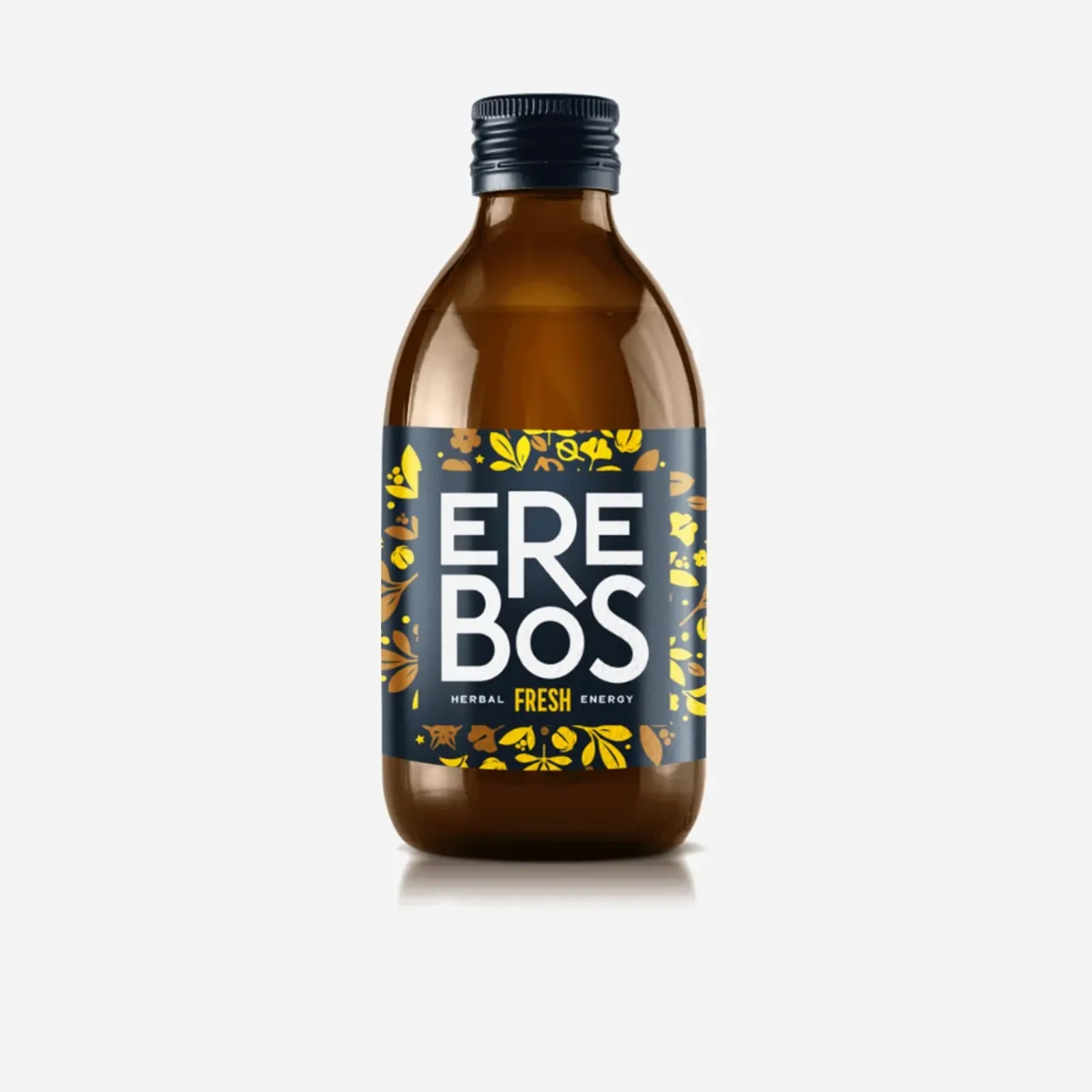 Zloženie: výluh zo 7 bylín Erebos (maté, bicykle, guarana, rhodiola, materina dúška, kozinec, maral), trstinový cukor, esencia Erebos FRESH ™ (prírodná aróma, výluh z bylín a korenín), vitamín C, antioxidant: kyselina citrónová. Neobsahuje konzervanty, farbivá ani umelé arómy. Pred vypitím dôkladne pretrepte. Skladujte v chlade a tme. Po otvorení ihneď spotrebujte. Sedimentácia bylín je znakom prírodného charakteru nápoja. Nápoj s vysokým obsahom prírodného kofeínu (39 mg / 100 ml) - nie je vhodný pre deti a tehotné alebo dojčiace ženy. Kofeín iba z bylín. Originálna česká receptúra.