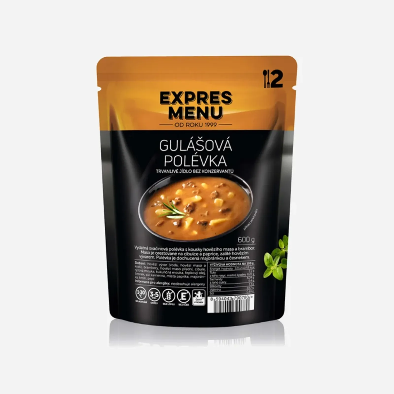 Zloženie: Hovädzie vývar (voda, hovädzie mäso a kosti), zemiaky, hovädzie mäso predné, cibuľa, ryžová múka, kukuričná múka, repkový olej, cesnak, soľ kamenná, mletá paprika, majorán, rasca, korenie.