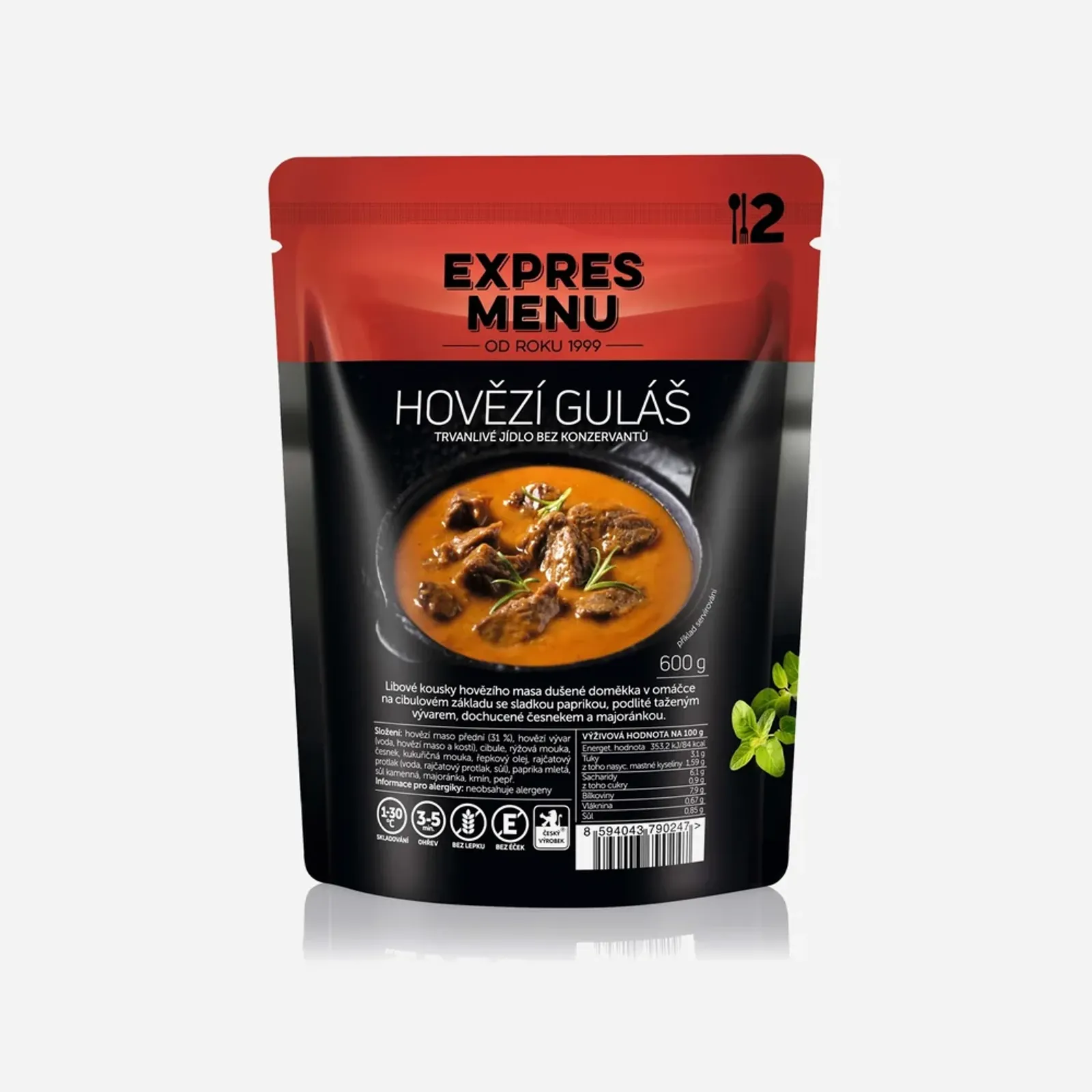 Zloženie: Hovädzie mäso predné 31%, hovädzie vývar (voda, hovädzie mäso a kosti), cibuľa, ryžová múka, cesnak, kukuričná múka, repkový olej, paradajkový pretlak (voda, paradajkový pretlak, soľ), paprika mletá , rasca, korenie.