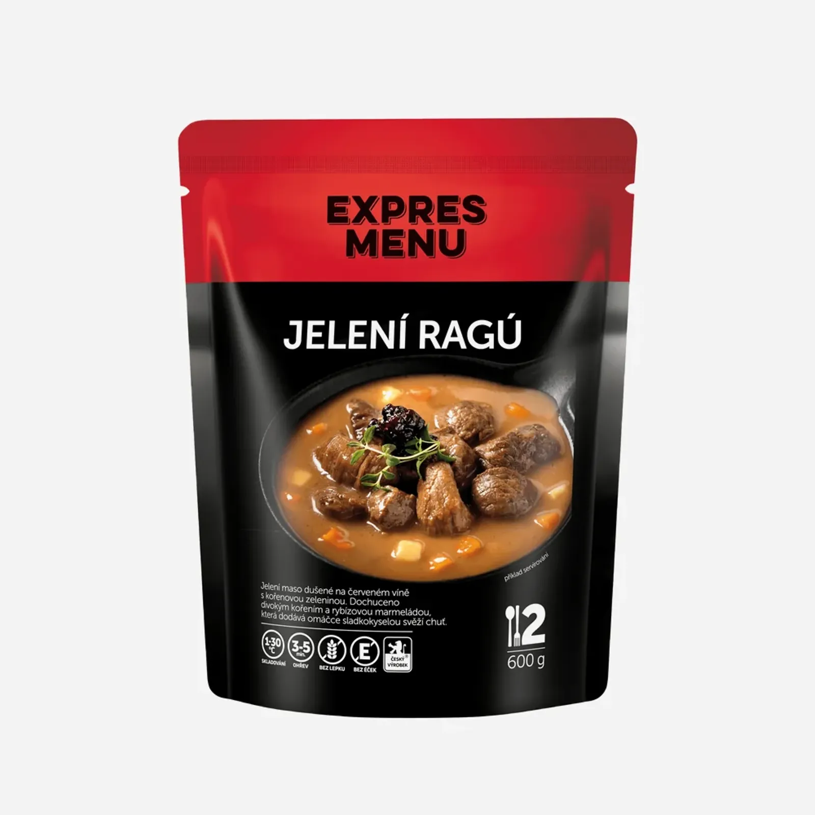 Zloženie: Jeleň 33 %, hovädzí vývar (voda, hovädzie mäso a kosti), koreňová zelenina (mrkva, zeler, paštrnák), červené víno, paradajkový pretlak (voda, paradajkový pretlak, soľ), cibuľa, repkový olej, ryžová múka, kukuričná múka, ríbezľový džem (ríbezle, cukor, pektín), cukor, citrón, kamenná soľ, divoké koreniny.