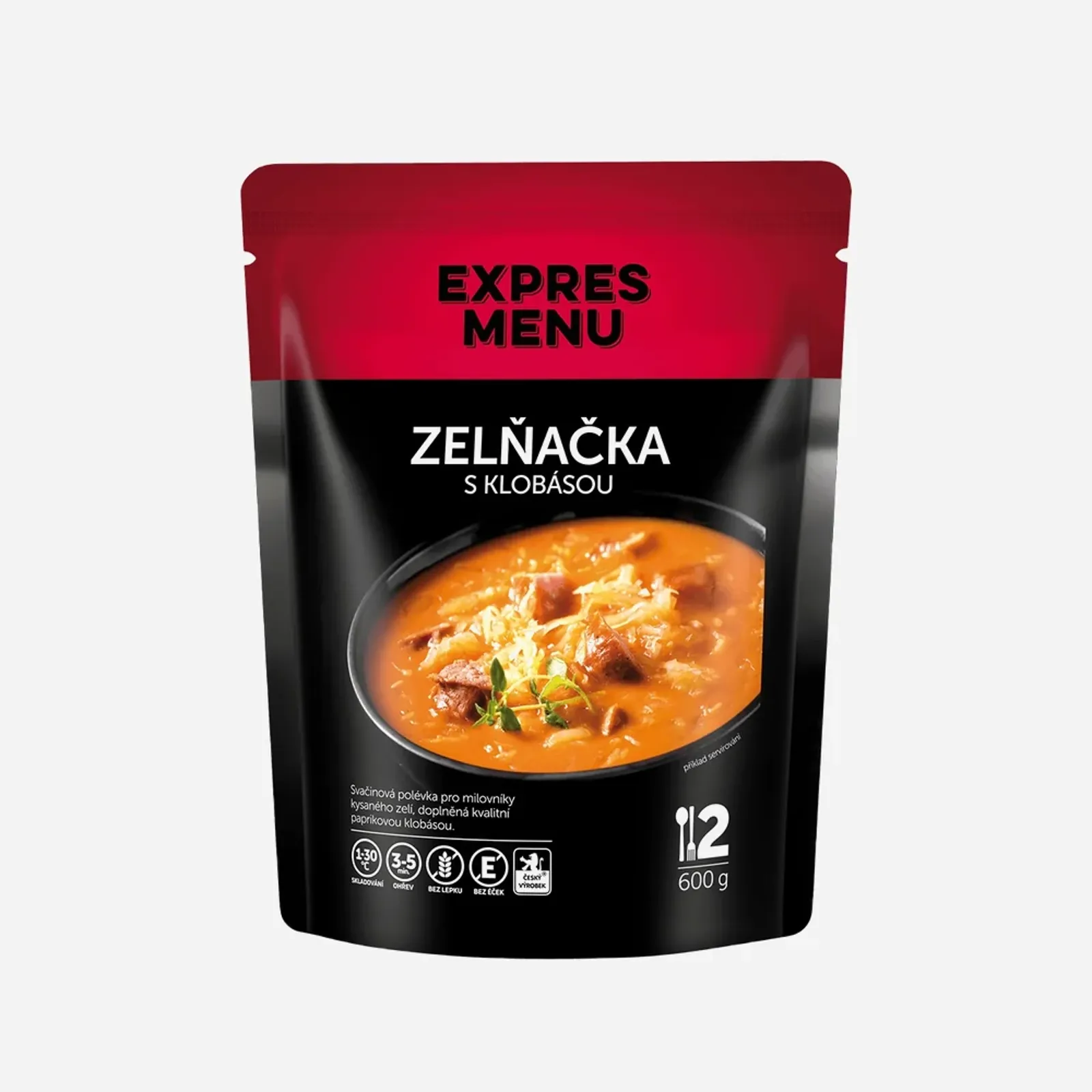 Zloženie: Hovädzí vývar (voda, hovädzie mäso a kosti), kyslá kapusta 13 % (biela kapusta, voda, soľ, rasca), bravčová klobása 4 % (bravčové mäso 86 %, voda, zemiakový škrob, soľ, bravčové bielkoviny, koreniny), smotana, cibuľa, ryžová múka, kukuričná múka, repkový olej, cesnak, kamenná soľ, mletá paprika, korenie, bobkový list.