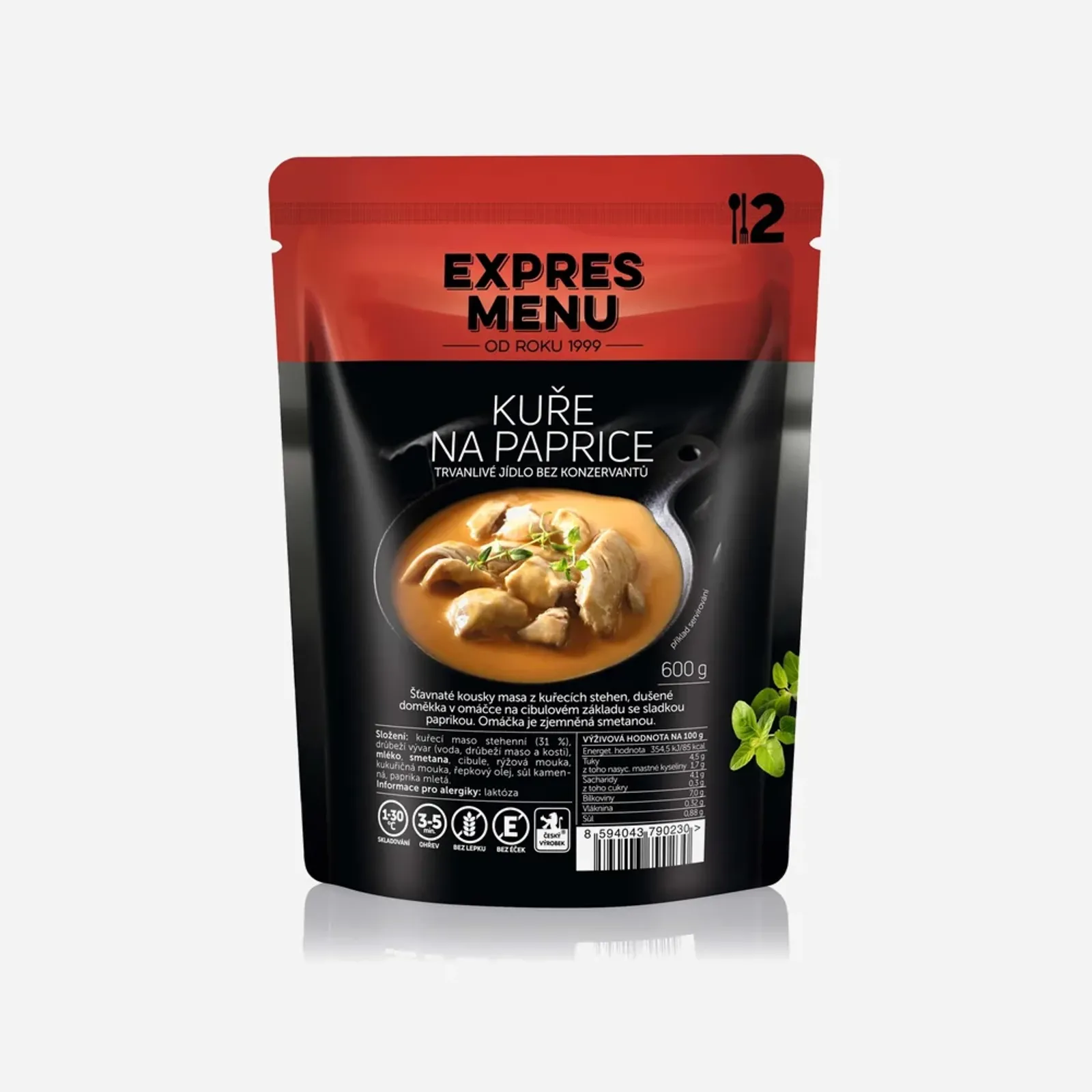 Šťavnaté kúsky mäsa z kuracích stehien, dusené domäkka v omáčke na cibuľovom základe so sladkou paprikou. Omáčka je zjemnená smotanou.
