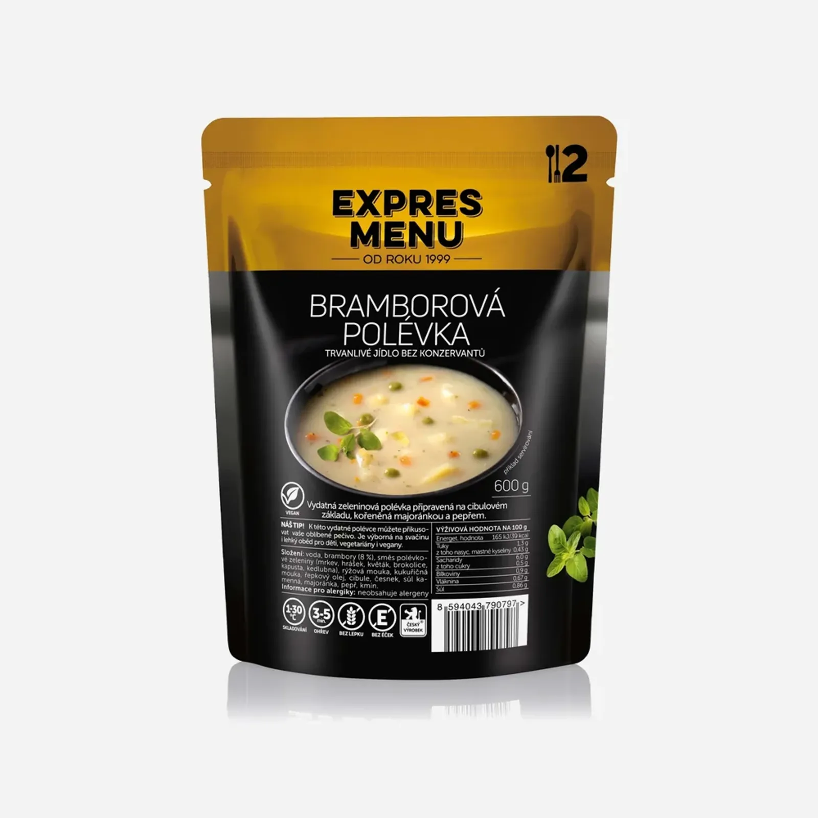 Zloženie: Voda, zemiaky 8%, zmes polievkovej zeleniny (mrkva, hrášok, karfiol, brokolica, kel, kaleráb), ryžová múka, kukuričná múka, repkový olej, cibuľa, cesnak, soľ kamenná, majoránka, korenie,