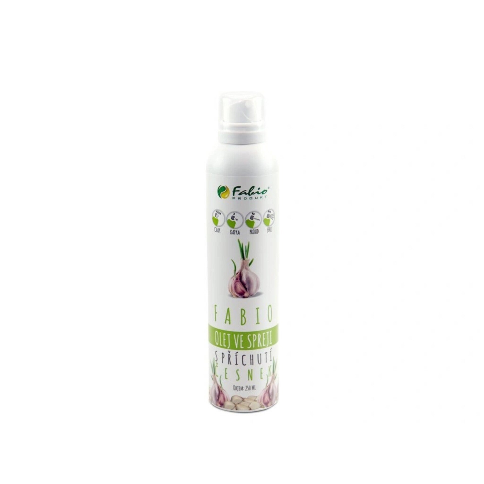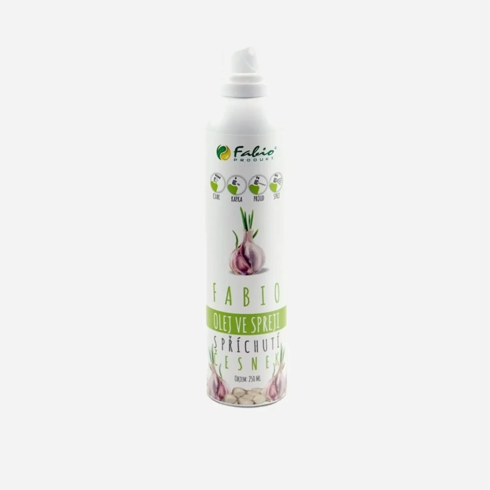 Olej v spreji Fabio s cesnakovou príchuťou je repkový olej ochutený extraktom korenia. Repkový olej je vhodný na každodenné použitie najmä vďaka priaznivému zloženiu mastných kyselín – konkrétne vysokému obsahu omega-3 nenasýtených mastných kyselín. Vďaka aplikácii pomocou spreja rovnomerne rozprestriete olej po celom jedle, pričom ďalšie 2 režimy rozprašovania (kvapka, prúd) vám výrazne uľahčia varenie.