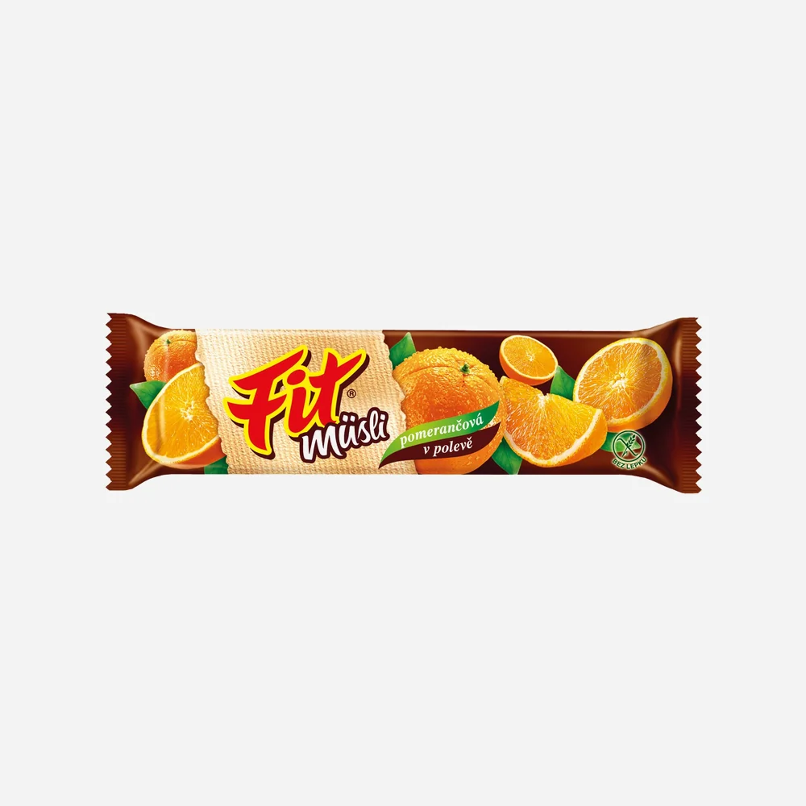 Müsli tyčinka FIT GO je cereálna tyčinka s príchuťou pomaranča, ktorá je čiastočne poliata čokoládovou polevou.
