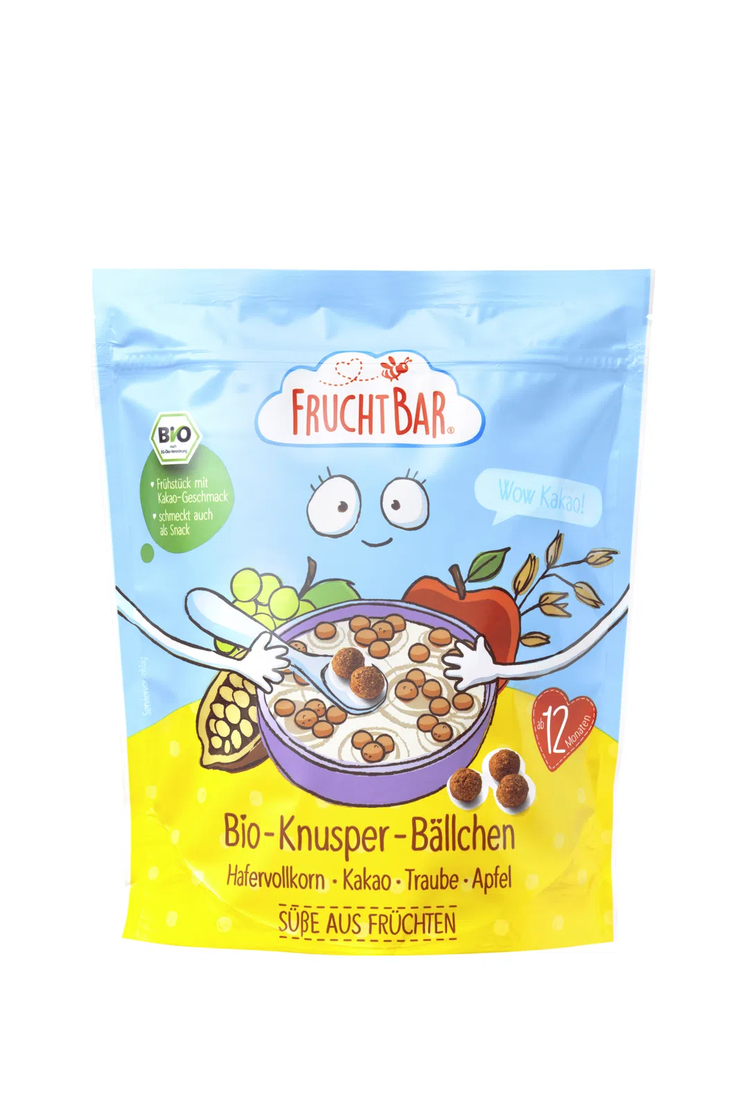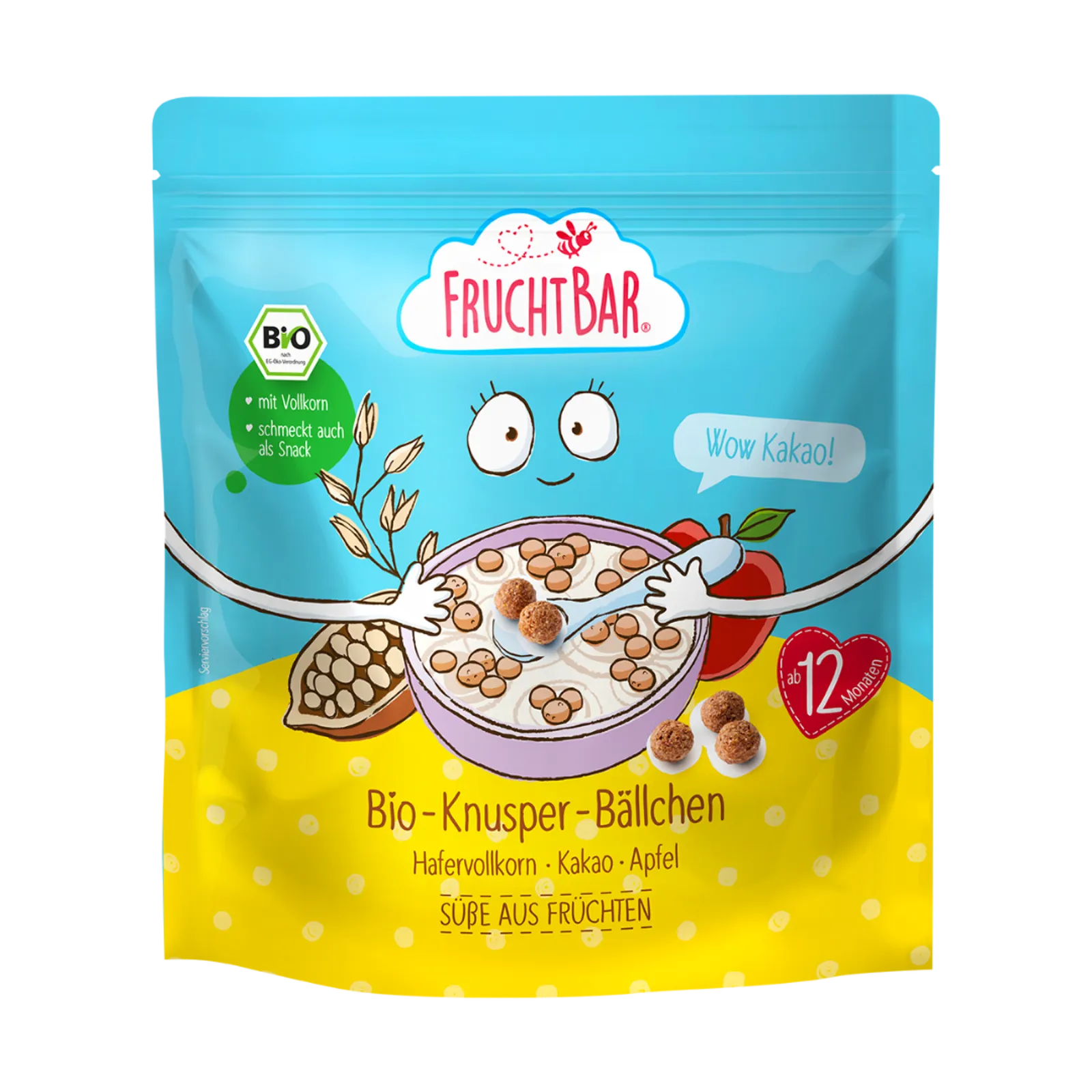 Od kedy môžete dávať deťom obilniny? Kakaové guľôčky FruchtBar sú určené pre deti od 12 mesiacov. Nie je v nich pridaný žiadny cukor, napriek tomu majú príjemne sladkú chuť vďaka hroznovej a jablkovej šťave. Doplňte ich mliekom alebo jogurtom a čerstvým ovocím a v okamihu máte zdravé raňajky alebo desiatu. Výrobok z certifikovaného ekologického poľnohospodárstva.