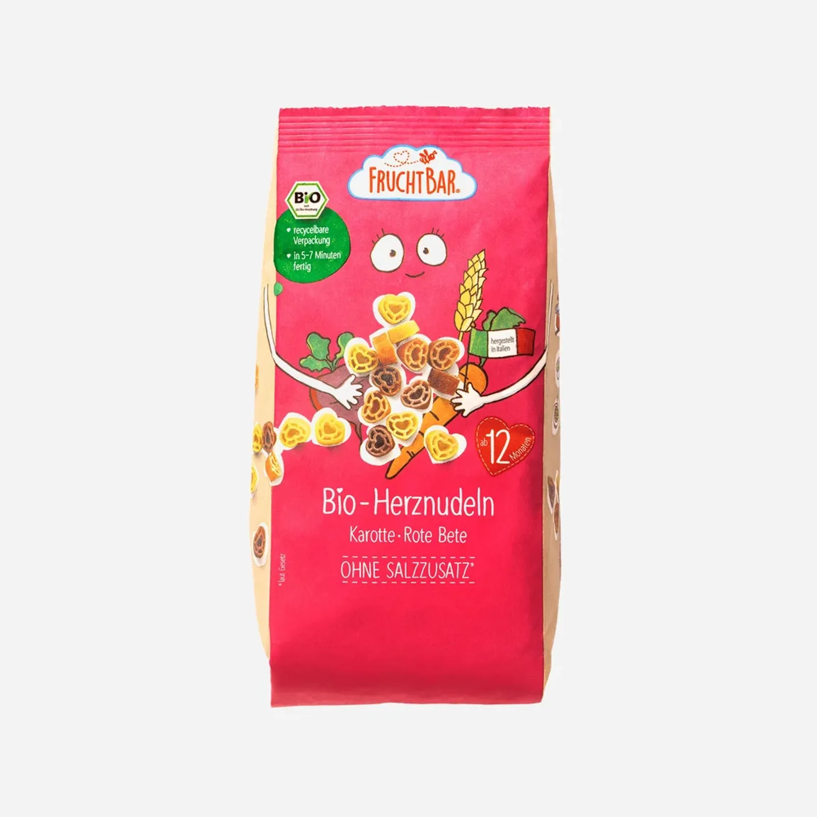 Čo je ešte lepšie ako cestoviny? Cestoviny v tvare srdca uvarené s láskou. Tieto cestoviny FruchtBar neobsahujú pridanú soľ a vďaka červenej repe a mrkve majú príťažlivú farbu. Sú vhodné pre deti od 12 mesiacov. Možno ich doplniť našimi hotovými omáčkami, ktoré stačí len zohriať. Výrobok z certifikovaného ekologického poľnohospodárstva.