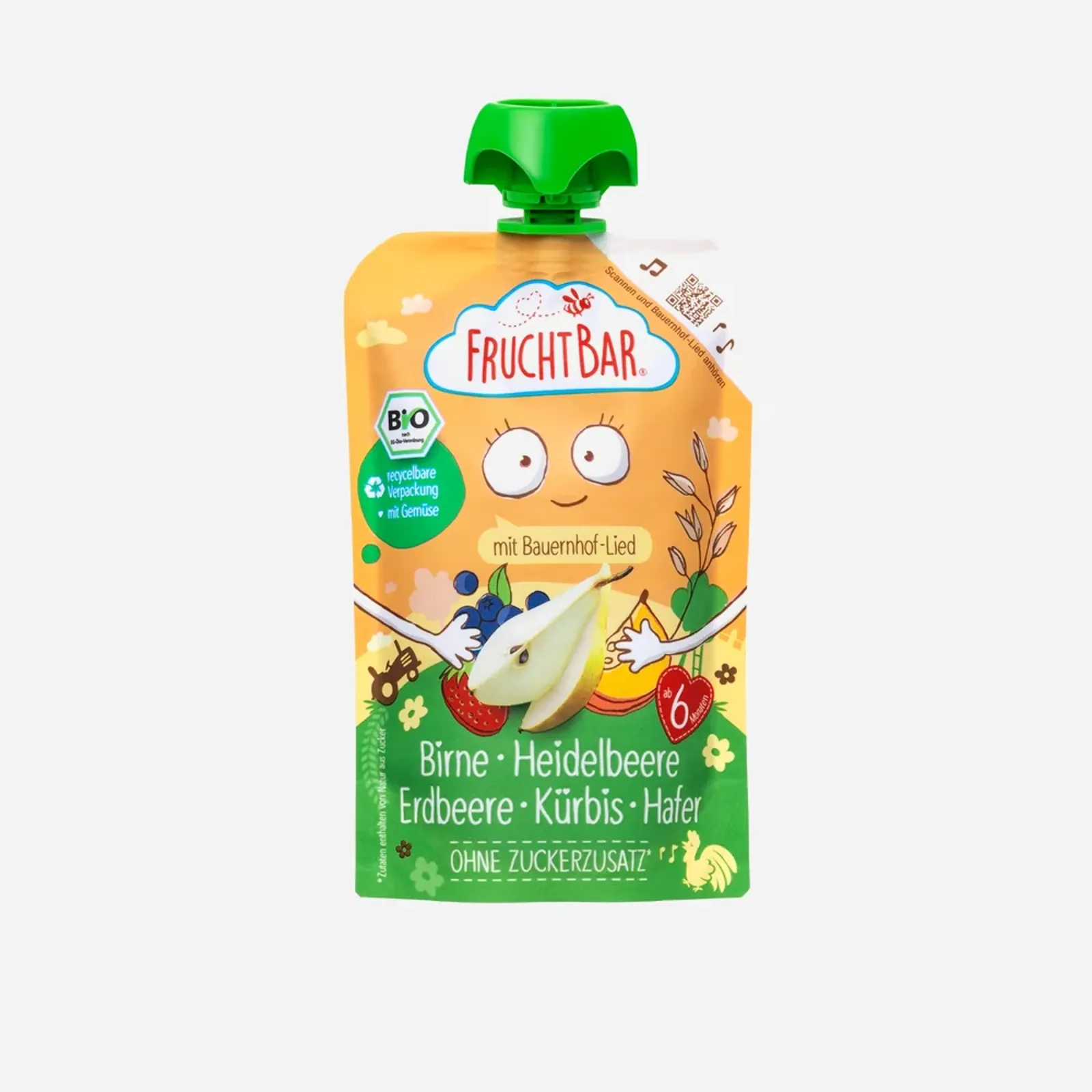 Ovocný snack, ktorý vďaka ovseným vločkám lepšie zasýti všetkých malých objaviteľov. Organická ovocná kapsička FruchtBar obsahuje pyré z hrušiek, jahôd, banánov, čučoriedok, tekvice a ovsených vločiek. Bez pridaného cukru, umelých aróm a konzervačných látok. Je vhodná pre deti od 6 mesiacov. Výrobok z certifikovaného ekologického poľnohospodárstva.