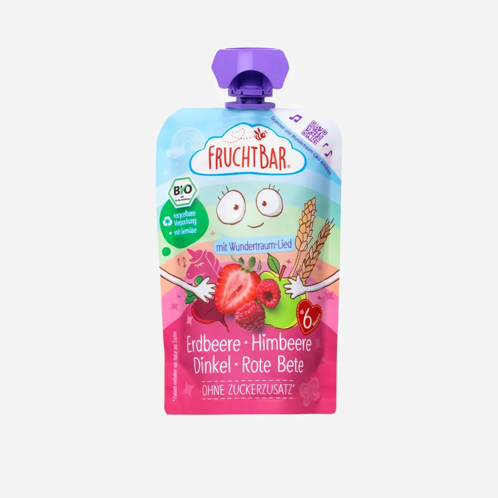 Dúhové občerstvenie poteší nielen jednorožcov. Vrecúško s bio ovocím FruchtBar obsahuje pyré z jabĺk, jahôd, malín, červenej repy a mletej špaldy. Nepridáva sa žiadny cukor, umelé arómy ani konzervačné látky. Je vhodná pre deti od 6 mesiacov. Výrobok z certifikovaného ekologického poľnohospodárstva.