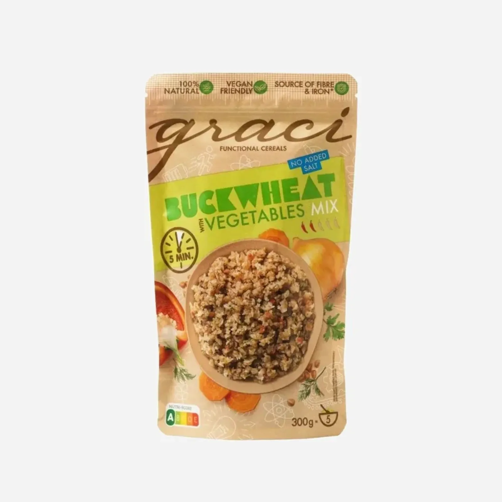 Plnohodnotná príloha k jedlu hotová za 5 minút. Graci funkčná pohánka so zeleninou je výborne ochutená zmes so 100% prírodným zložením a rýchlou prípravou.