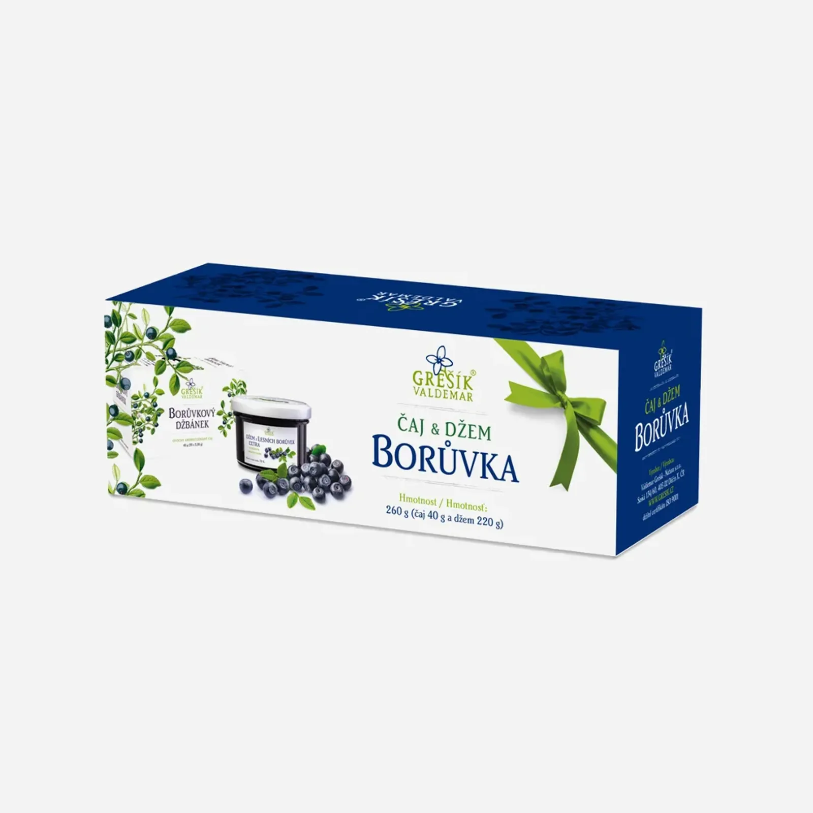 Kazeta obsahuje ovocný čaj Čučoriedkový džbánok 20 sáčkov a Džem z lesných čučoriedok extra Špeciálna 220 g.