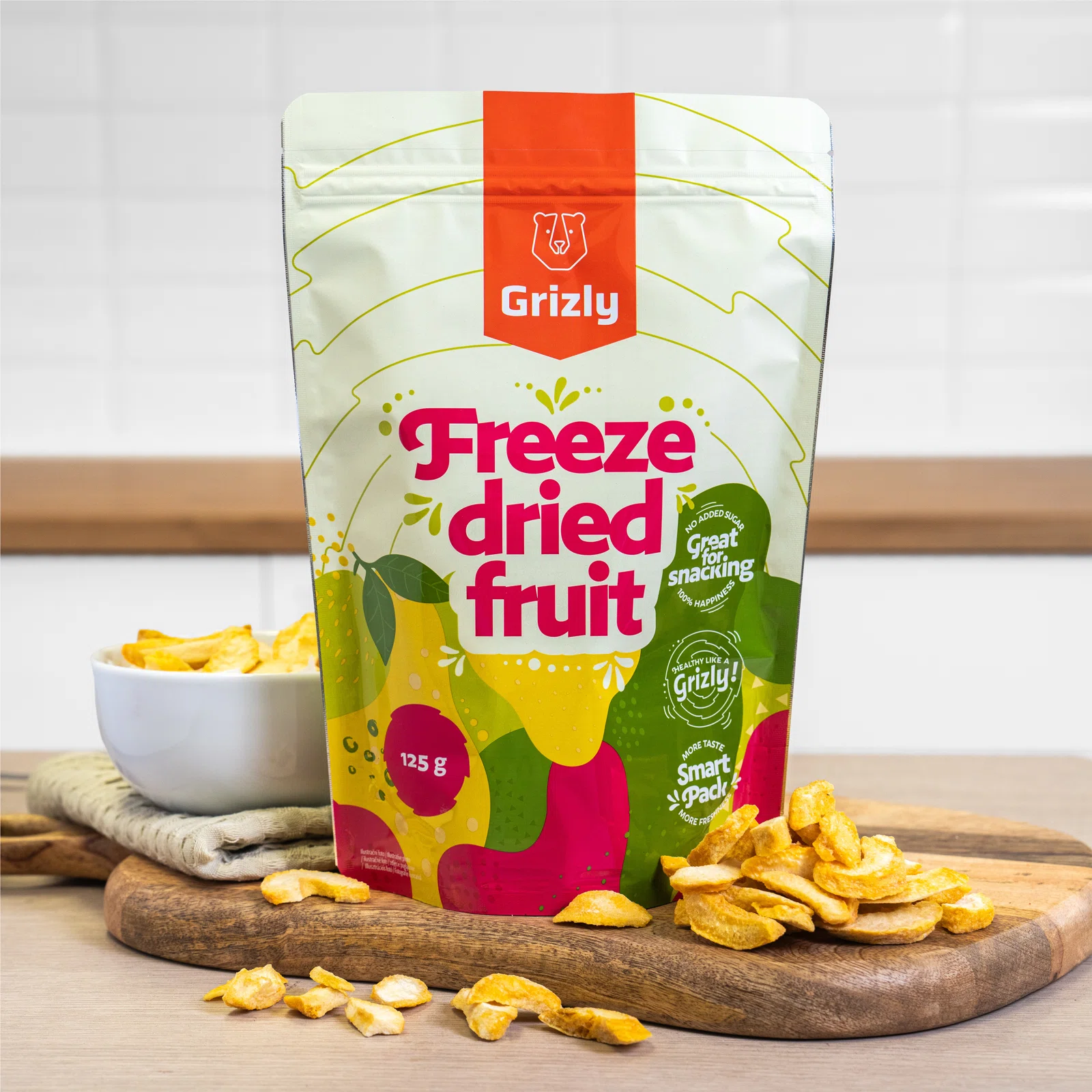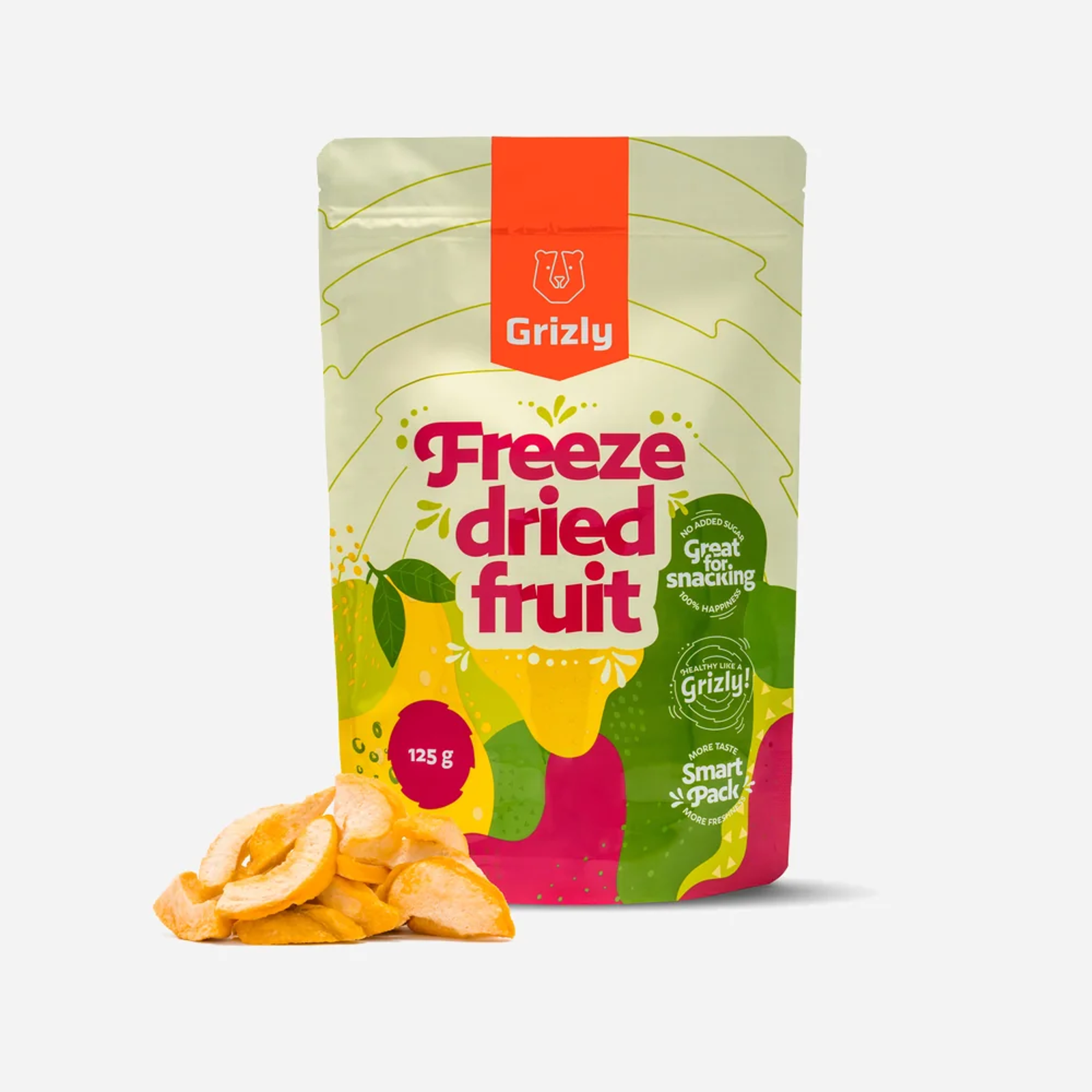 Mrazom sušené broskyne GRIZLY si môžete vychutnať aj vo väčšom balení vďaka uzatvárateľnému obalu, ktorý ich uchováva chrumkavé a čerstvé.