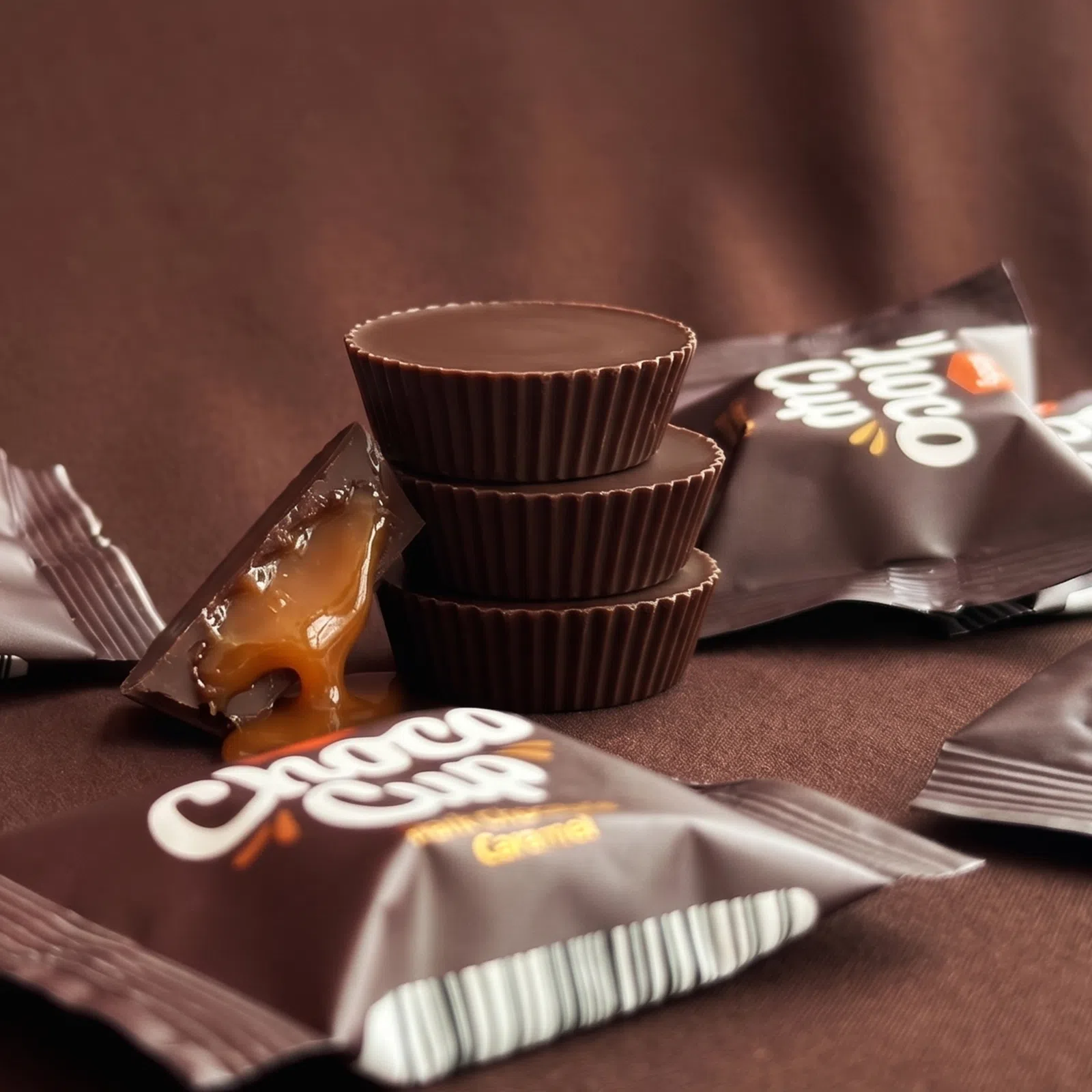 Čokoládové košíčky so 70 % horkou čokoládou a jemnou karamelovou náplňou. Tá prináša sladšiu chuť so slaným dozvukom, ktorý vyvažuje intenzitu čokolády. Praktická veľkosť na rýchlu sladkú pauzu.