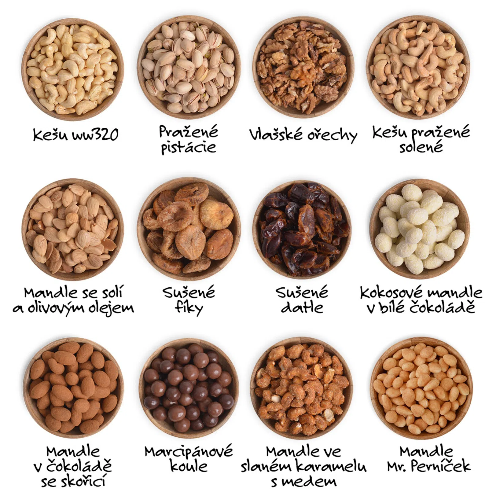 Upravené suché škrupinové plody. Zloženie: jadrá pražených mandlí 76 %, cukor, včelí med 3,5 %, morská soľ 2 %. Môže obsahovať stopy arašidov a iných škrupinových plodov. Skladujete v suchu, chráňte pred teplom a priamym slnečným žiarením.