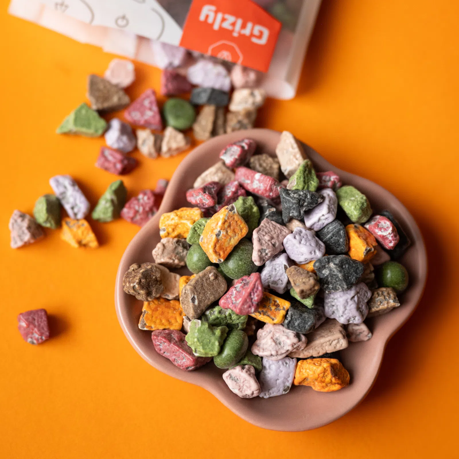 Kamienky sú vzhľadovo veľmi pekné, no to je asi tak všetko. Chuťovo to veru nie je žiadna bomba. Môžu sa použiť na dekoráciu, ale maximálne jeden kamienok na jeden väčší kus (muffin, kúsok torty, cupcake), aby sa to chuťovo stratilo, inak ten dezert akurát tak pokazíte. Neviem ako tú chuť popísať, ale pripomína mi to kus margarínu, ktorý už dlhšie stál v chladničke a bol v pomere 1:2 zmiešaný s cukrom. Kamienky mi pripadajú extrémne sladké, možno je v nich aj nejaká stopa kakaa, ale pachuť niečoho (možno starší palmový olej) ju úplne prebila. Je mi ľúto produkt vyhodiť. Po troške ich snáď miniem, no už by som ich druhýkrát nekúpila. Zato ale určite kúpim Grizly lentilky, pretože tie sú naopak chutné a naozaj pripomínajú lentilky od známej nemenovanej značky.