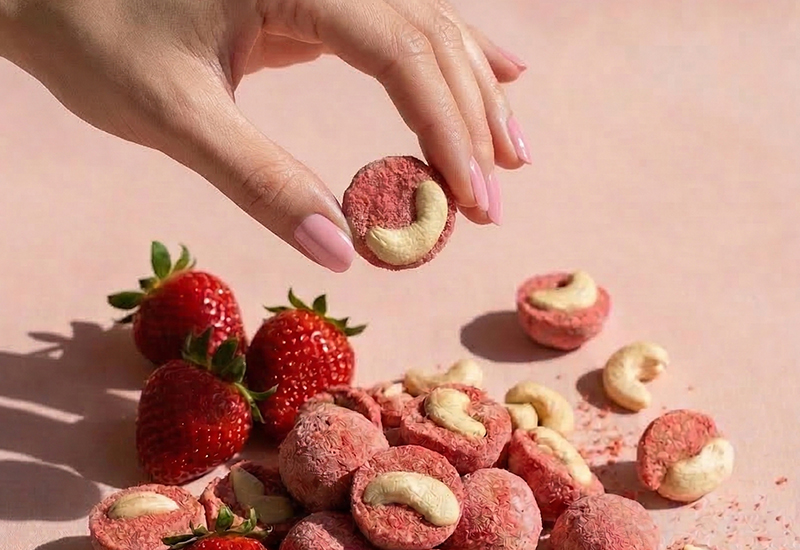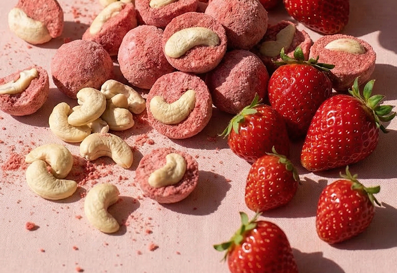 Spojenie chrumkavých nepražených kešu orechov a intenzívneho prachu z jahôd sušených mrazom. Táto čisto prírodná pochúťka neobsahuje žiadny pridaný cukor. Skvele chutia len tak na zobkanie, ale aj v kaši alebo ako ozdoba dezertov.