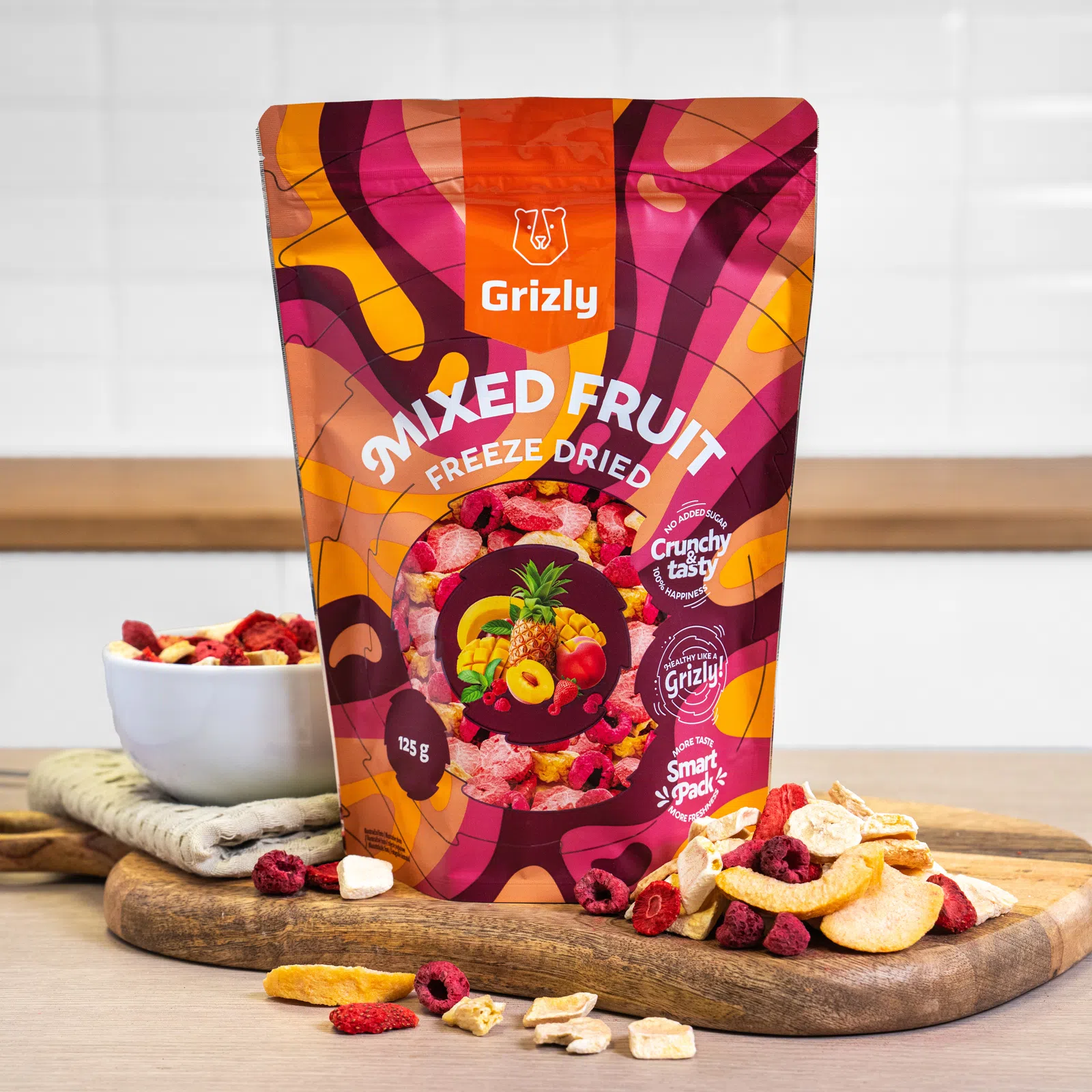 Pestrá zmes ovocia sušeného mrazom obsahuje jahody a maliny, doplnené plátkami banánu a kúskami ananásu, broskýň a manga. Potešenie pre vaše chuťové bunky vo výhodnom balení.