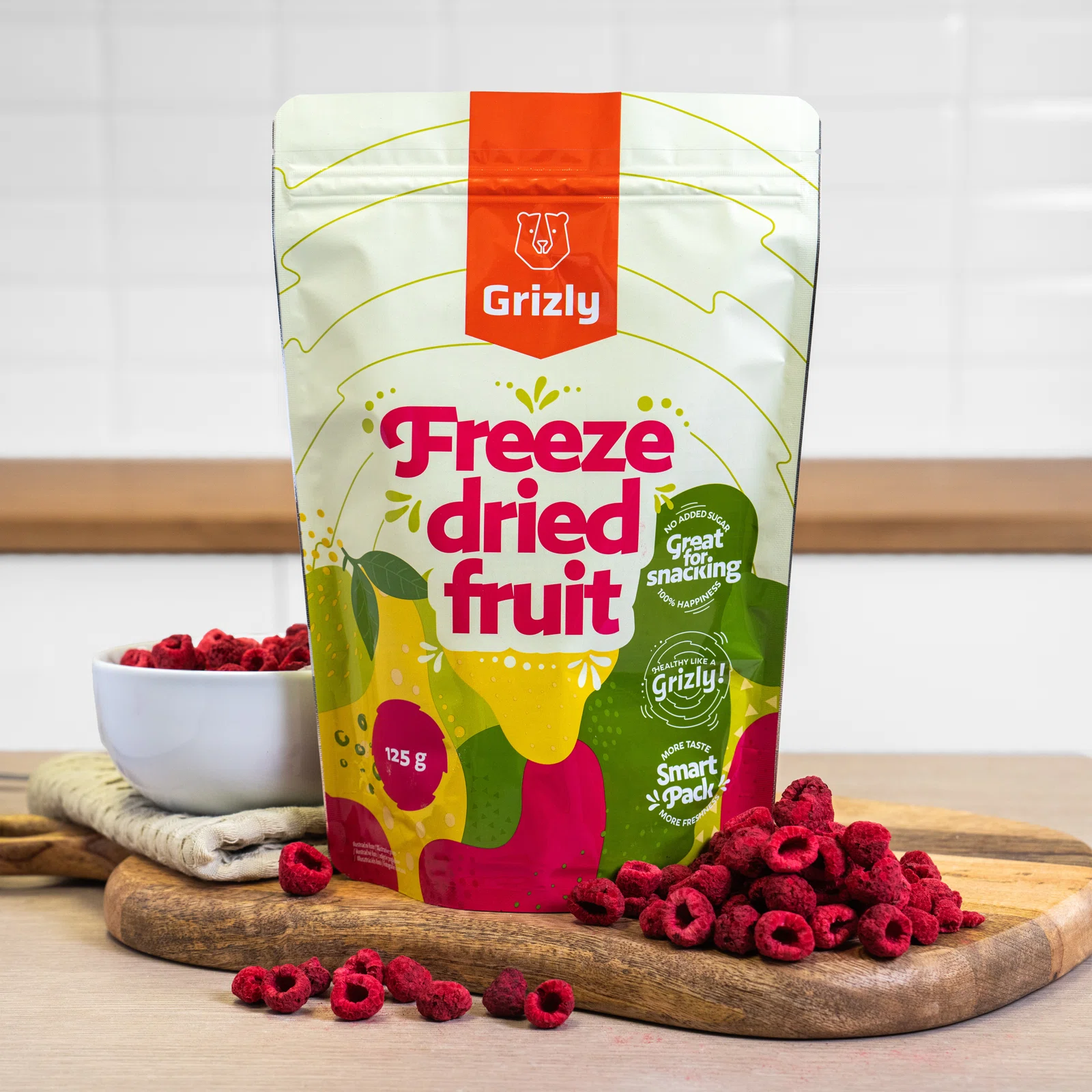Mrazom sušené maliny GRIZLY sú chutnou a zdravou pochúťkou. Vďaka uzatvárateľnému obalu sú čerstvé a chrumkavé až do poslednej porcie.