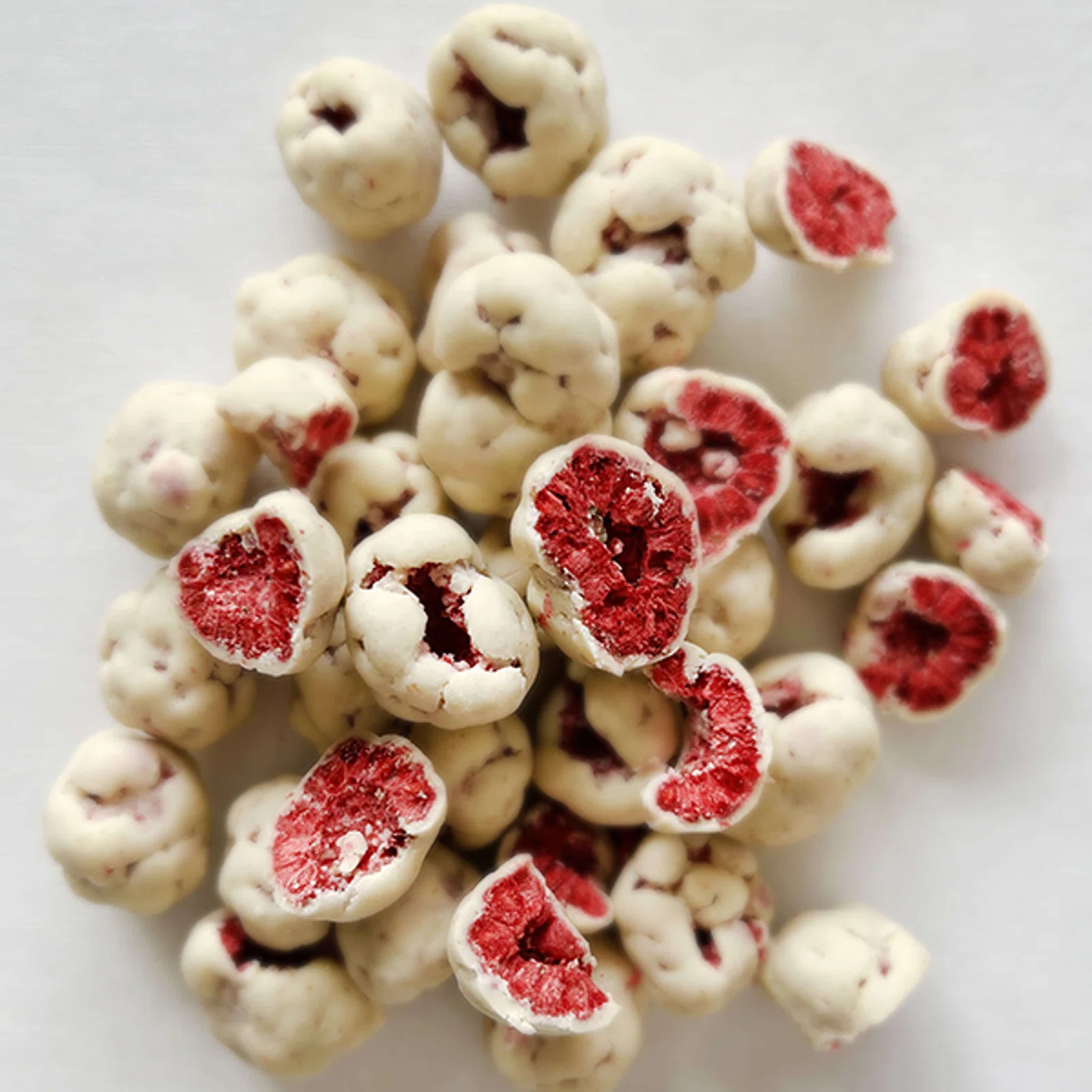 Tenká vrstva jemnej bielej belgickej čokolády a orieškového krému White Brownie v sebe ukrýva voňavé maliny sušené mrazom.