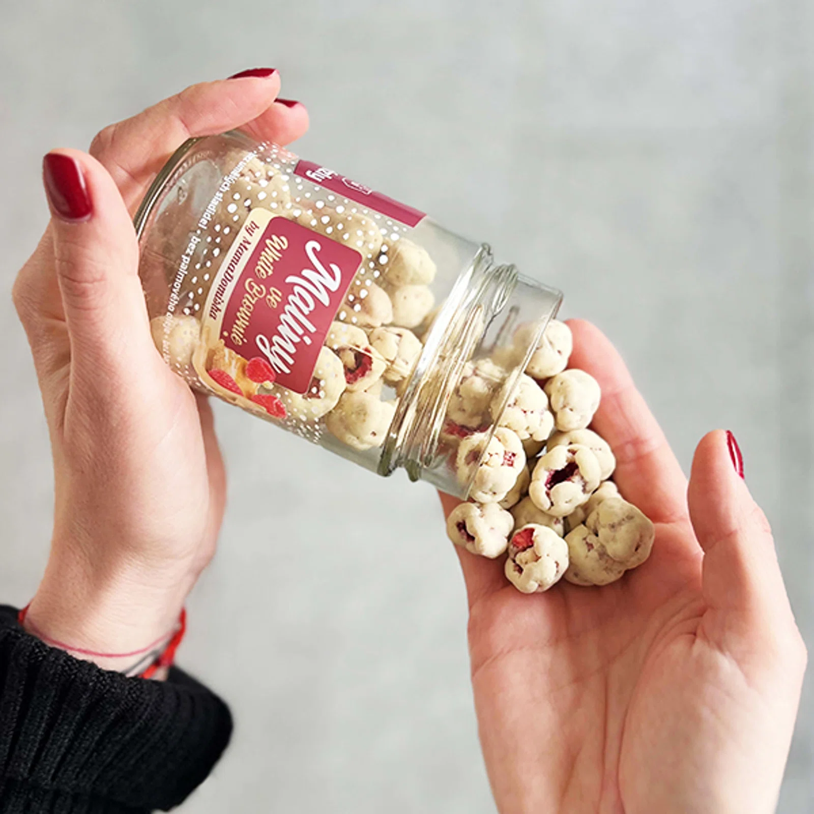 Ideálna kombinácia sladkokyslej chuti. Chrumkavé lyofilizované maliny sme obalili tenkou vrstvou krému z kvalitnej bielej čokolády a obľúbeného lieskovo-orieškového krému White brownie. Oplatí sa ich mať poruke, keď vás prepadne chuť na niečo sladké. Tieto čokoládové kúsky sa výborne hodia aj ako ľahké občerstvenie počas posedenia s priateľmi alebo pri večernom relaxe s dobrým filmom či knihou. Ak chcete ochutnať viac lyofilizovaného ovocia v čokoláde by @mamadomisha, odporúčame vyskúšať napríklad jahody v mliečnej čokoláde s krémom Jarmilla.