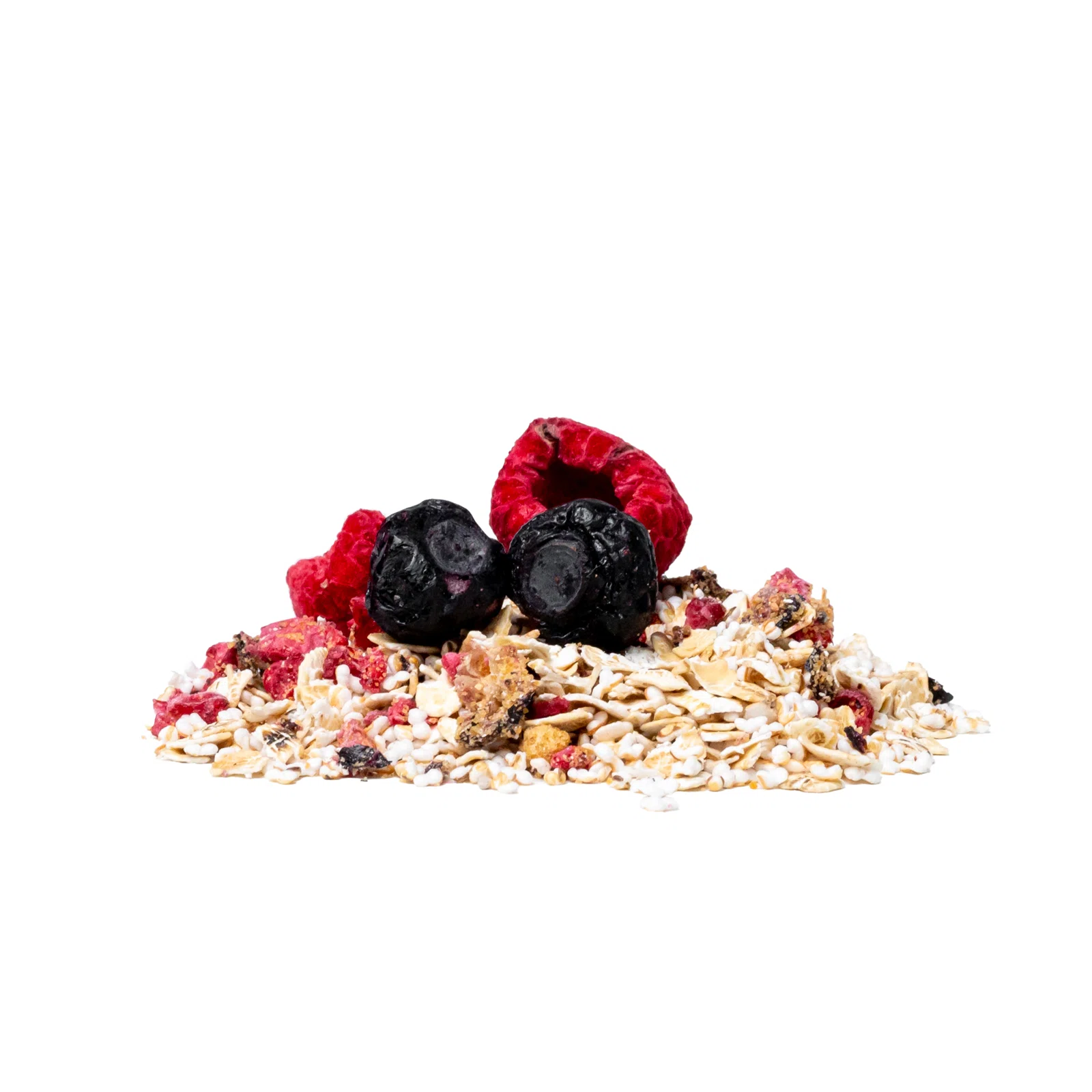 Ako vždy – len z dobrých surovín! Kúsky mrazených čučoriedok a malín dopĺňajú bezlepkové ovsené vločky s klíčkami, ktoré sú v porovnaní s nenaklíčeným zrnom oveľa lepšie stráviteľné. V zložení kaše nájdete aj chia semienka, pufovaný amarant a sušenú trstinovú šťavu.