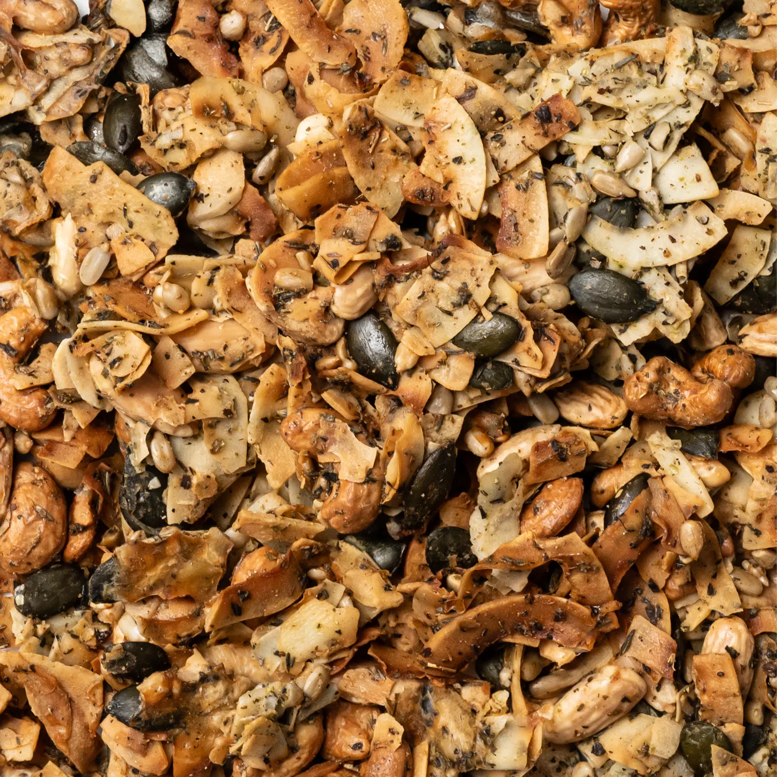 | Zloženie: | kokosové plátky 28 %, kešu orechy 22 %, mandle natural 20 %, tekvicové semienka 9 %, slnečnicové semienka 9 %, olivový olej, sušený vaječný bielok, sušené droždie, provensálske korenie 1,8 % (tymián, bazalka, rozmarín, majorán, saturejka, levanduľový kvet, šalvia), himalájska soľ. |