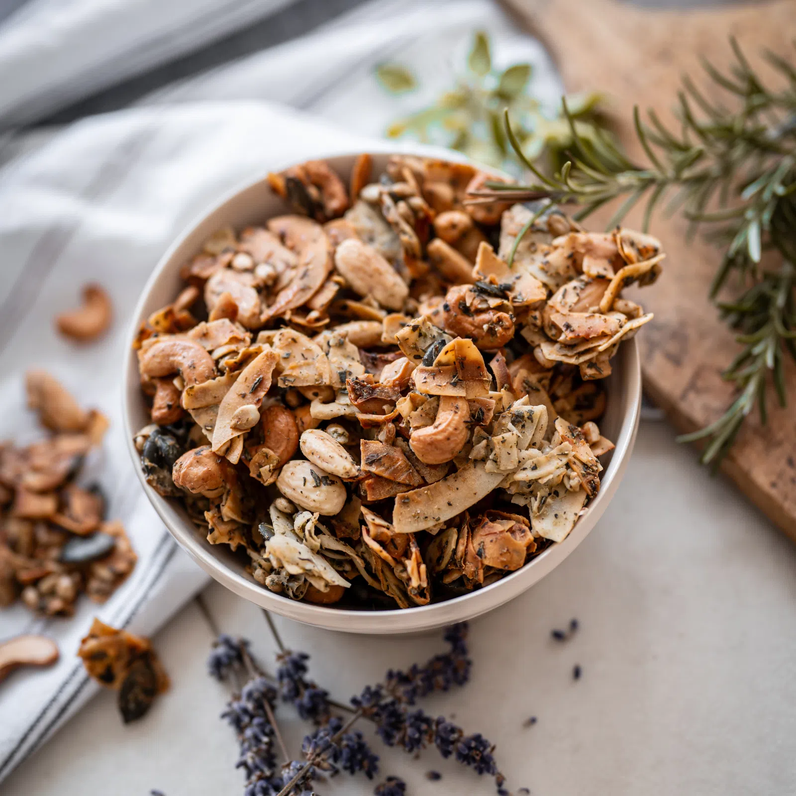 Skvelo namiešaný slaný mix orechov, kokosových plátkov a korenia pripomína vzhľadom granolu, no chuťou určite nie! Inšpiráciu sme čerpali z krásneho vzdialeného Provensálska. A rovnako ako Provence, aj táto zdravá pochúťka nádherne vonia. Navyše je bez cukru, lepku aj mlieka.
