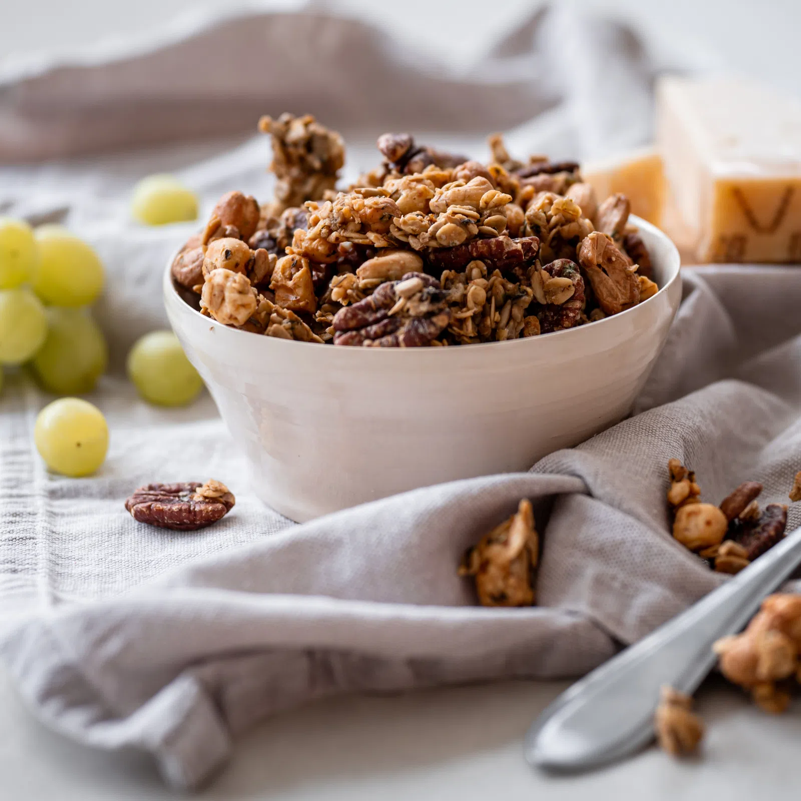 Namiešali sme ho z bezlepkových ovsených vločiek, kešu orechov, pekánov, slnečnicových semienok, sušenej Goudy, sušeného Cheddaru, olivového oleja, štipky himalájskej soli a zmesi korenín, medzi ktorými nechýba bazalka, pamajorán či medvedí cesnak. Dali sme ho zapiecť a hotovo! Chrumkavý syrový mix s orechmi je na svete! Nám chutí a vám určite tiež. Navyše je bez cukru a lepku. Tak na čo ešte čakáte, šup s ním do košíka!