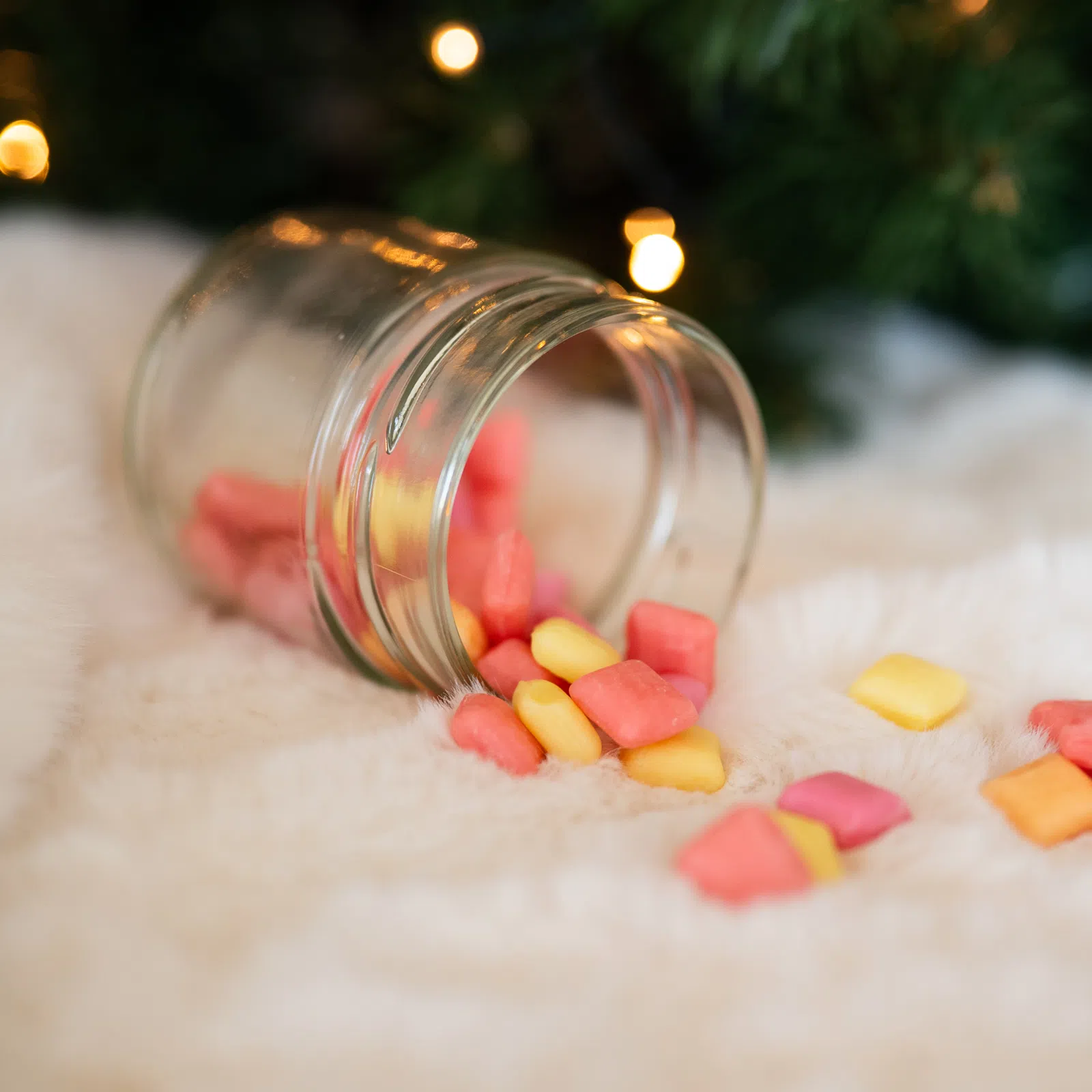 Keď ochutnáte ovocné žuvačkové obláčiky, okamžite vás uchváti ich skvelá chuť. Môžete si vybrať, či najprv ochutnáte citrónový, pomarančový alebo malinový nadýchaný obláčik. Nechali sme ich zabaliť do krásneho obalu s vianočnými motívmi, aby medzi všetkými tými krásnymi produktmi na sviatočné menu neboli nevhodné. A určite nezahanbia ani svojim zložením, pretože neobsahujú žiadne umelé farbivá ani arómy.